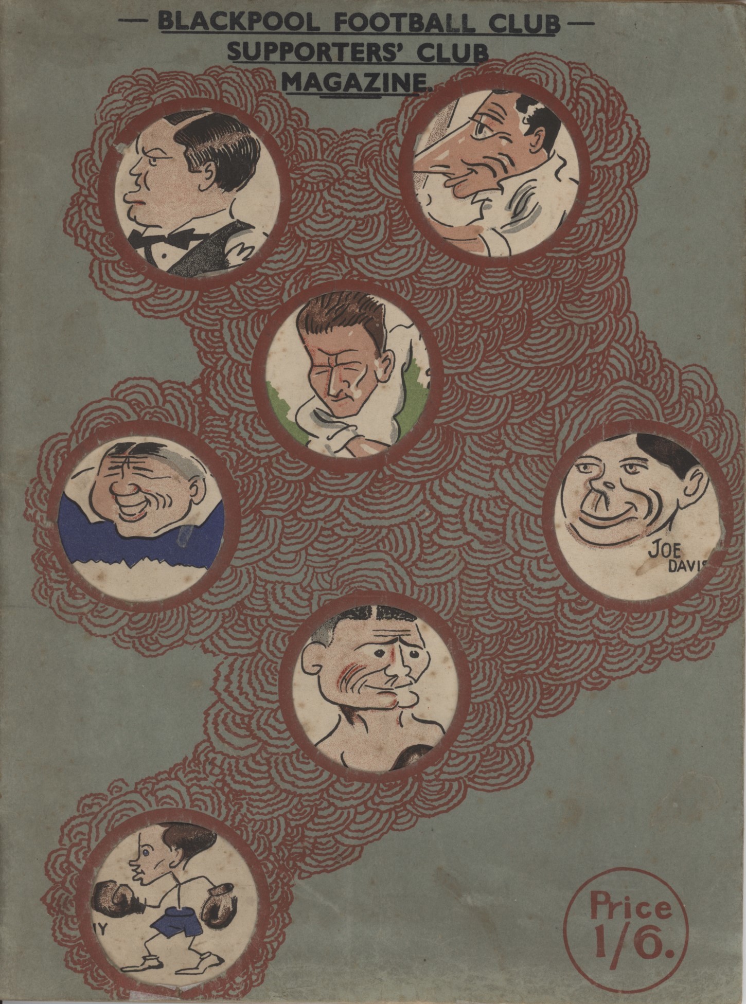 A superb post-war issue of the fanzine featuring not only pieces concerned with Blackpool F.C., including Stanley Matthews, but also range of short articles on contemporary stories in cricket, boxing, snooker and billiards, nicely illustrated throughout not least by a peep-hole cover revealing caricatured stars (by Tom Webster) such as Joe Davis, Harold Larwood, Jack Hobbs and Jim Driscoll.