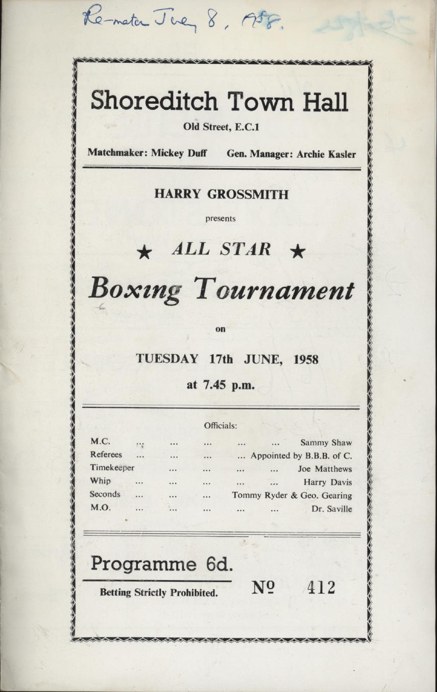 Official boxing programme for the fight held in Shoreditch on June 17th, 1958.
