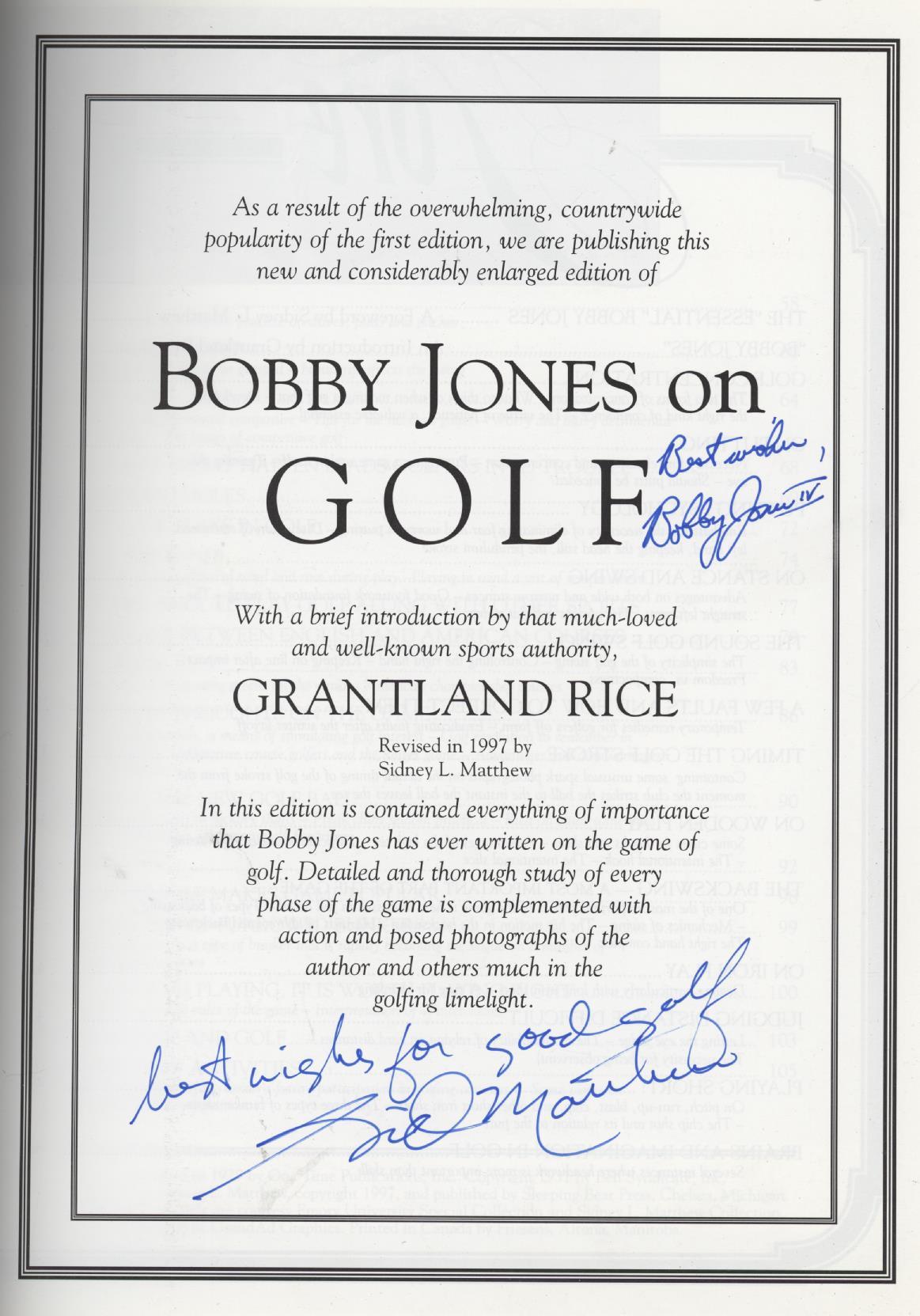 Paperback, slim folio. 104pp. including photos. Internally very good, near fine, clean and bright with. In the original glossy illustrated full colour wraps. Signed to the title page by Sidney L. Matthew, Jones' biographer who provides the foreword, and by Bobby Jones IV, Jones' grandson.
