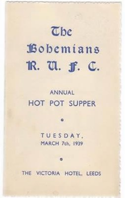 Menu card for the Bohemians RUFC Annual Hot Pot Supper at the Victoria Hotel, Leeds, on 7 Mar 1939.