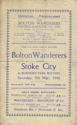 Official programme for the Bolton v Stoke match on March 9 1946 in the sixth round of the FA Cup. Shortly before kick-off a section of the densely-packed crowd in the north west corner of the ground swayed uncontrollably, two crush barriers collapsed and many spectators fell forward on top of those in front of them. Under the pile of humanity, 33 people were killed and 500 injured.