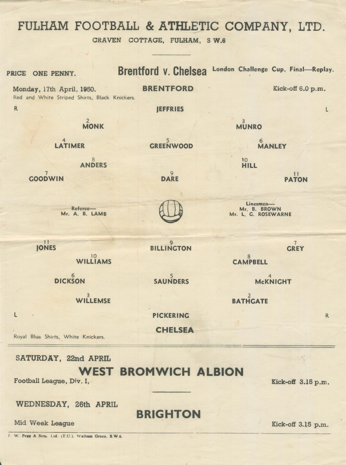 Original programme for the London Challenge Cup Final (replay), played at Craven Cottage on April 17th 1950. The first match was drawn 4-4 and the replay, played over 4 months later, was won by Chelsea 3-0.