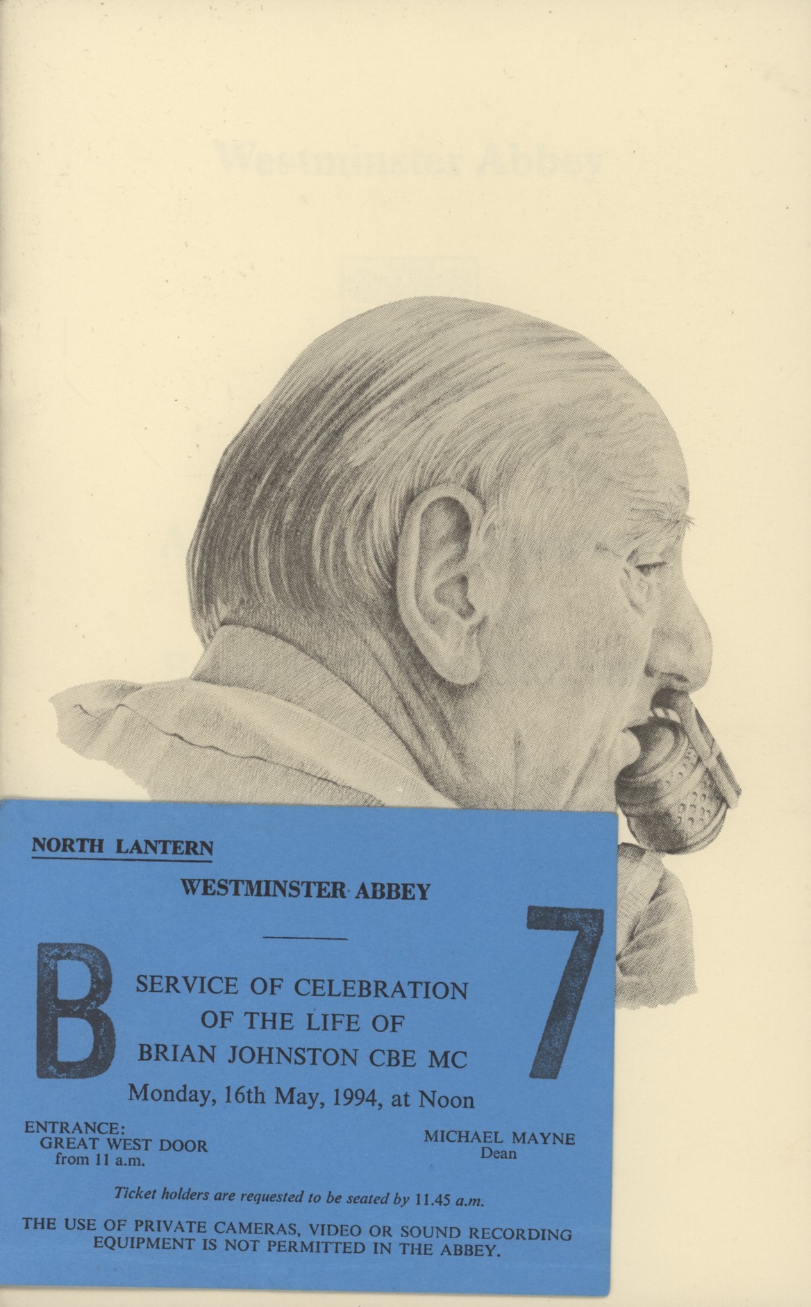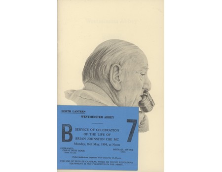 An Order of Service for a Celebration of the Life of Brian Johnston, held at Westminster Abbey on May 16th 1994. The addresses were by Colin Cowdrey and John Major. A couple of relevant Press cuttings are slipped in. Also comes with the orignal admission ticket.
