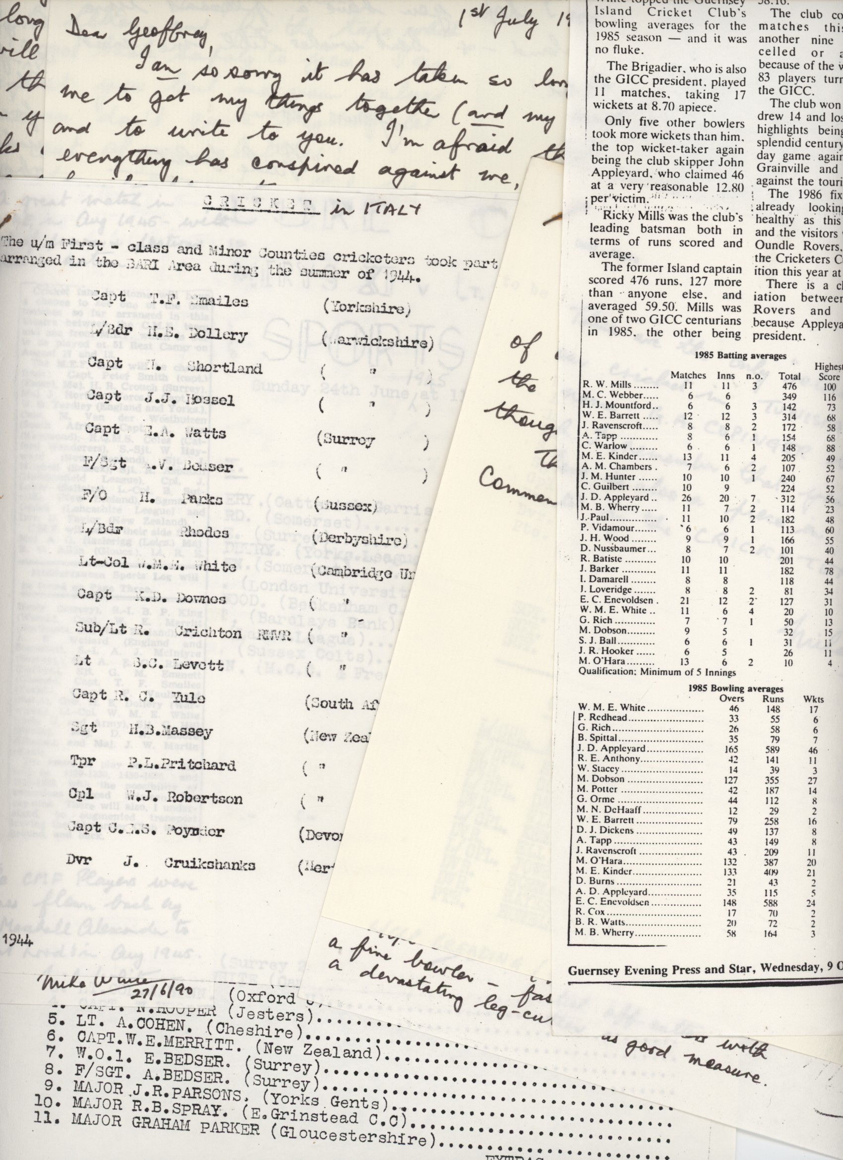 A collection of three autograph letters and associated papers from the former Northamptonshire County Cricket Club player of the 1930s and 40s, who also represented Cambridge University and became aide-de-camp to the Queen in the 1960s, sent to his friend the cricket collector Geoffrey Coppinger in 1990. The material is largely concerned with military cricket matches and his later days playing successfully for Guernsey Island CC. There is also an annotated draft of Brigadier White's 11-page cricket recollections: 'From Dover to Lord's - A Very Personal Memoir'.