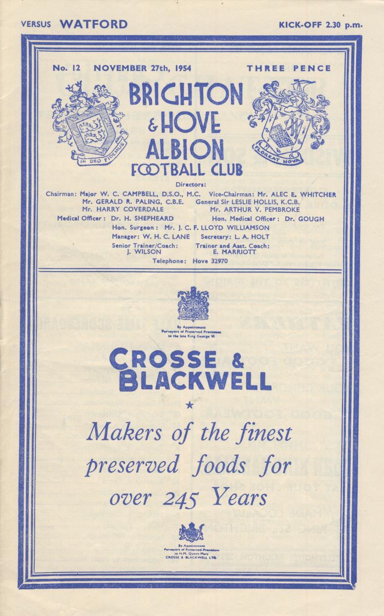 BRIGHTON & HOVE ALBION V WATFORD 1954-55 FOOTBALL PROGRAMME