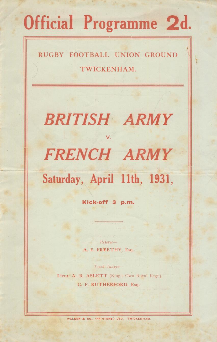 BRITISH ARMY V FRENCH ARMY 1931 RUGBY PROGRAMME