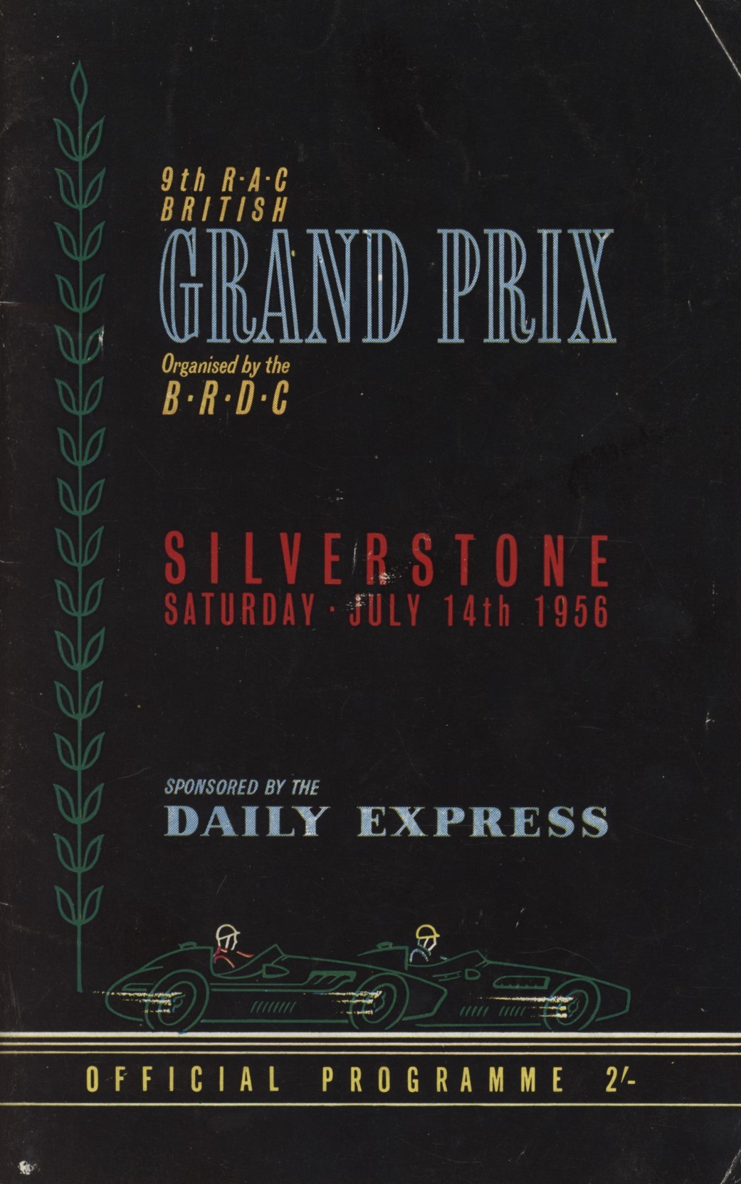 Official programme for the R.A.C. British Grand Prix held at Silverstone, 14th July 1956. The race was won for Ferrari by the Argentinian driver, Juan Manuel Fangio, who subsequently went on to claim his third successive (and fourth overall) Formula One World Championship. His teammates Peter Collins and de Portago were second, sharing a drive.