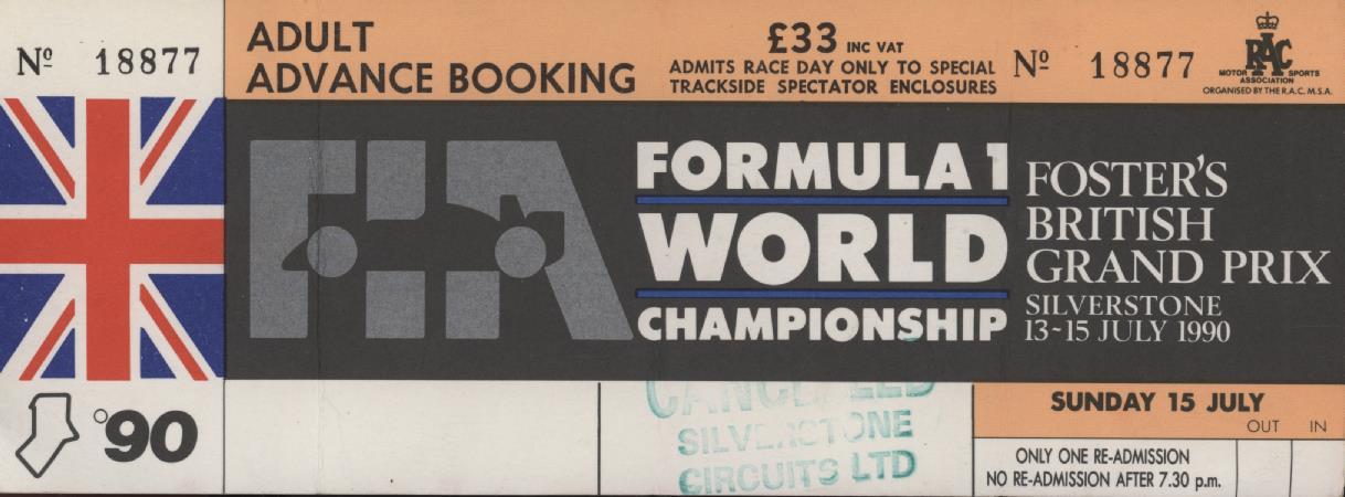 Original ticket for the 1990 British Grand Prix on July 15th. Prost won with Senna third.