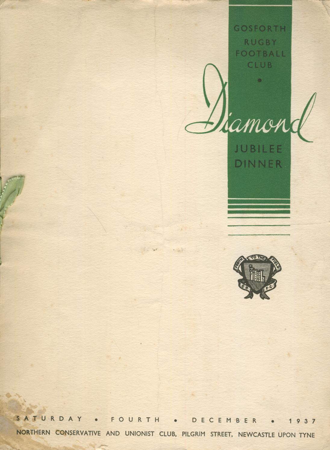 GOSFORTH RUGBY FOOTBALL CLUB DIAMOND JUBILEE DINNER 1937 MENU CARD