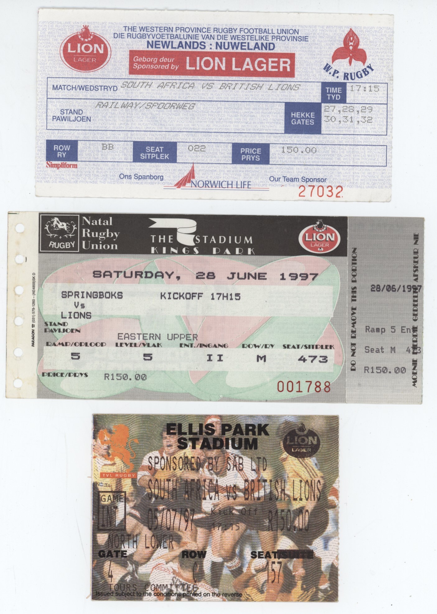 Original tickets for all three Test matches between the British and Irish Lions and South Africa in 1997. The Lions won the series 2-1, including the famous win in Durban after Jeremy Guscott's drop goal.