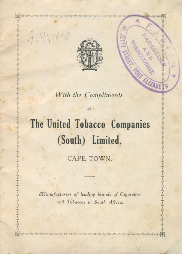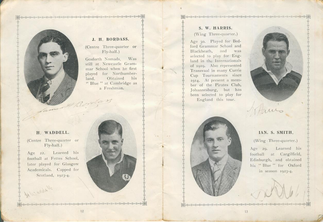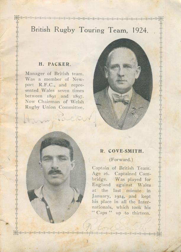Rugby tour brochure published by the United Tobacco Companies Ltd., Cape Town, to accompany the 1924 British Lions tour to South Africa. Contains photographic and pen portraits of all the tourists and many prominent South African players. Also contains details of previous Lions and Springbok tours, back to 1891. Fixtures list to last page, completed neatly in ink - the tourists won 9 matches but lost three Tests and drew one. Signed to their portraits, and occasionally elsewhere, by 30 British Lions players and staff - Packer, Cove-Smith, Cunningham, Marsden Jones, Voyce, D.S. Davies, Blakiston, MacPherson, Roche, Clinch, Hendrie, Ross, Harold Davies, Howie, McVicker, Henderson, Whitley, Young, Griffiths, Bordass, Waddell, S.W. Harris, Smith, Kinnear, Gaisford, Drysdale, Bradley, Brand, Wallace and one other (unidentified). Also signed by a number of the South Africans - F.W. Mellish, T.L. Kruger, B. Osler, K. Starke and one other (also unidentified). PLEASE NOTE: the centre four-page spread (pages 19-22), which would presumably have had more pen and photographic images of South African players, are missing.