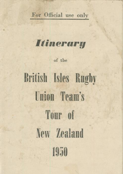 Official itinerary of the British Lions rugby tour to New Zealand in 1950. This would have been issued to players, staff and others closely linked to the tour. Includes fixtures, daily itineraries, hotel details and full team list.