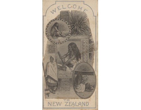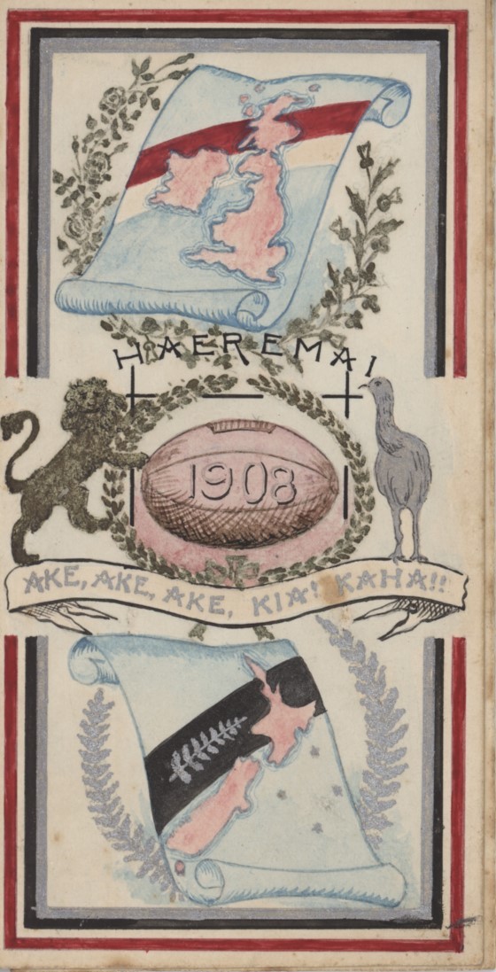 Folded card with original artwork for the itinerary of the British Lions rugby tour to New Zealand in 1908. The front cover is handpainted with intricate designs, including scrolled maps, emblems and the date set inside a rugby ball. The back cover has cut out images of Maoris with the message "Welcome To New Zealand". There are further pencil notes relating to the planned lay-out inside.