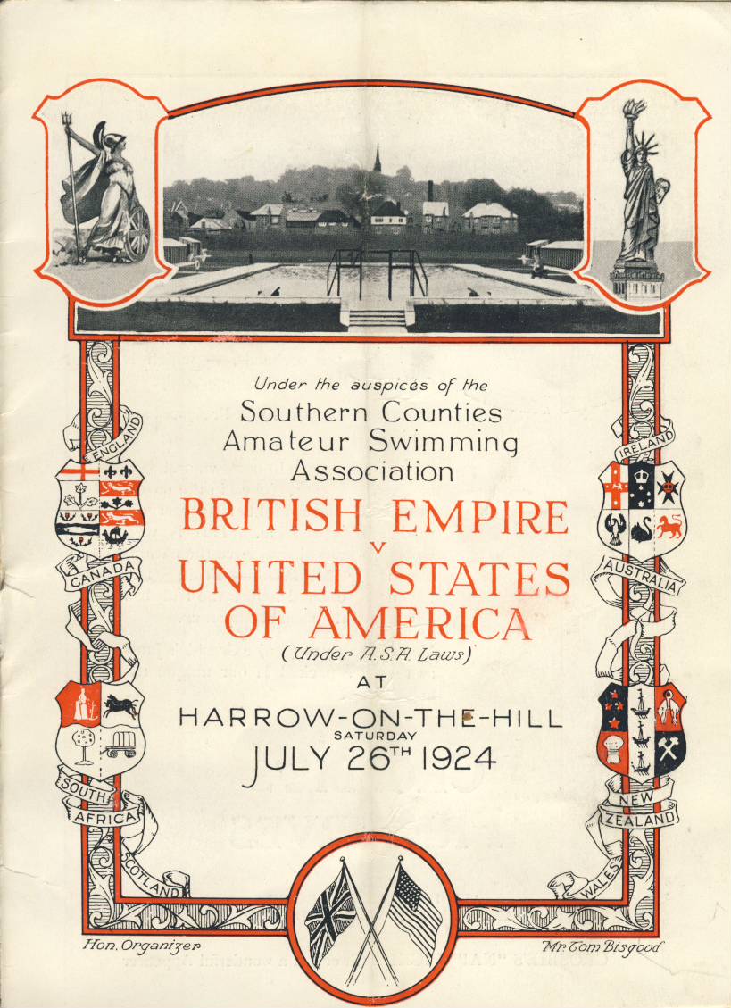 Souvenir programme for a swimming match organised by the Southern Counties Amateur Swimming Association, and held at Harrow-On-The-Hill on July 26th 1924. The match was arranged for the teams dispersing from the Olympic Games in Paris (the closing ceremony for the whole games was on the following day). The USA team included Johnny Weismuller, who had collected 3 gold medals in Paris; Martha Norelius, the youngest gold medallist at the games; and many other gold medallists going back to 1908.