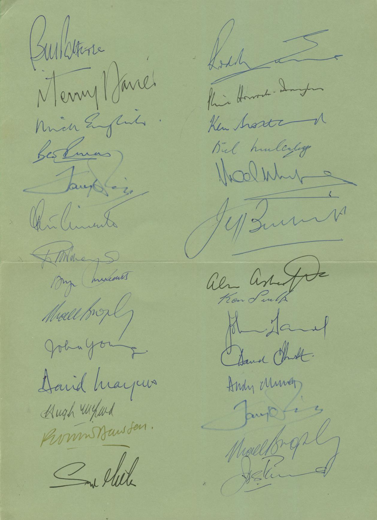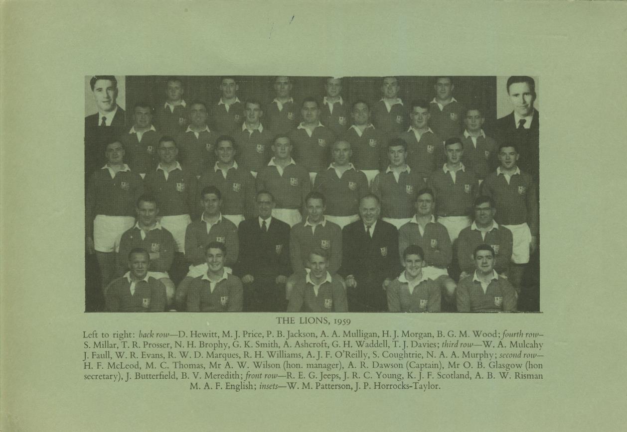 Signed in ink to centre pages by attending members of the Lions touring party: Millar, Brophy (twice), Smith, Ashcroft, Terry Davies, Mulcahy, Faull, Marques, O'Reilly (twice), Murphy, Mcleod, Dawson, Butterfield, Meredith, Young, Scotland, Risman, English, Patterson, Horrocks-Taylor and four unidentified. An outstanding item, previously the property of the famous Welsh rugby reporter, J.B.G. Thomas.