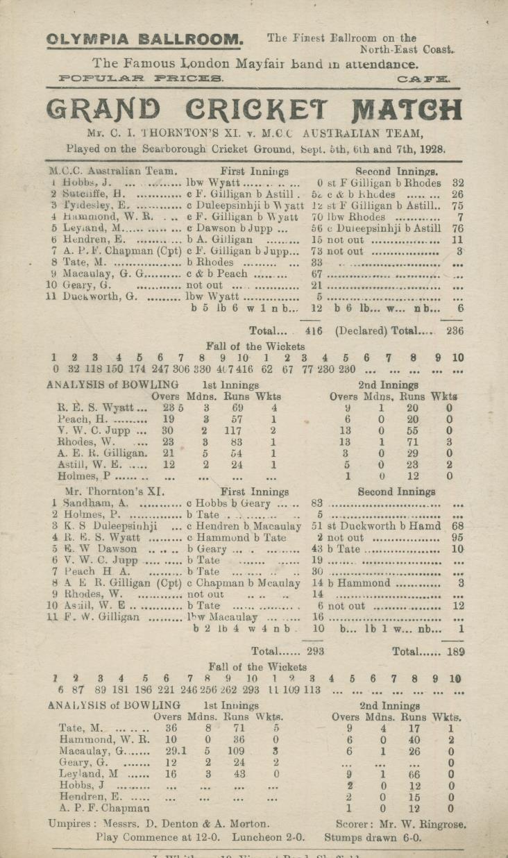 Official scorecard for the match played at Scarborough on September 5-7, 1928. Thornton's XI was very strong, with the likes of Sandham, Holmes, Duleep, Wyatt, Gilligan and Rhodes but the match ended in a competitive draw.