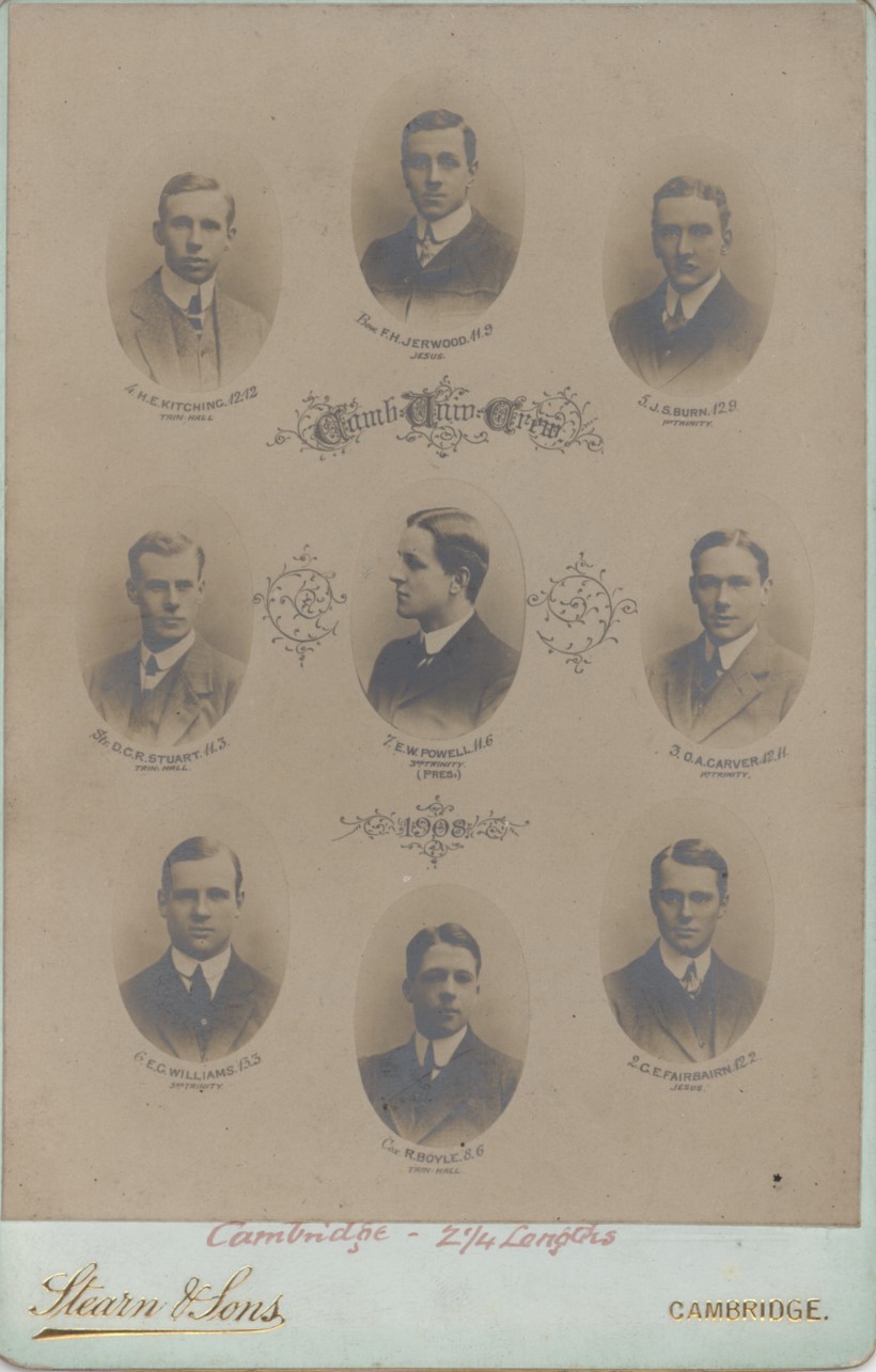 Cabinet card with photographic portraits of the Boat Race crew, including the cox. Margin of victory (Cambridge - 2.25 lengths) written in red ink to lower border. Stearn & Sons, Cambridge. All of the crew competed in the 1908 Olympics.
