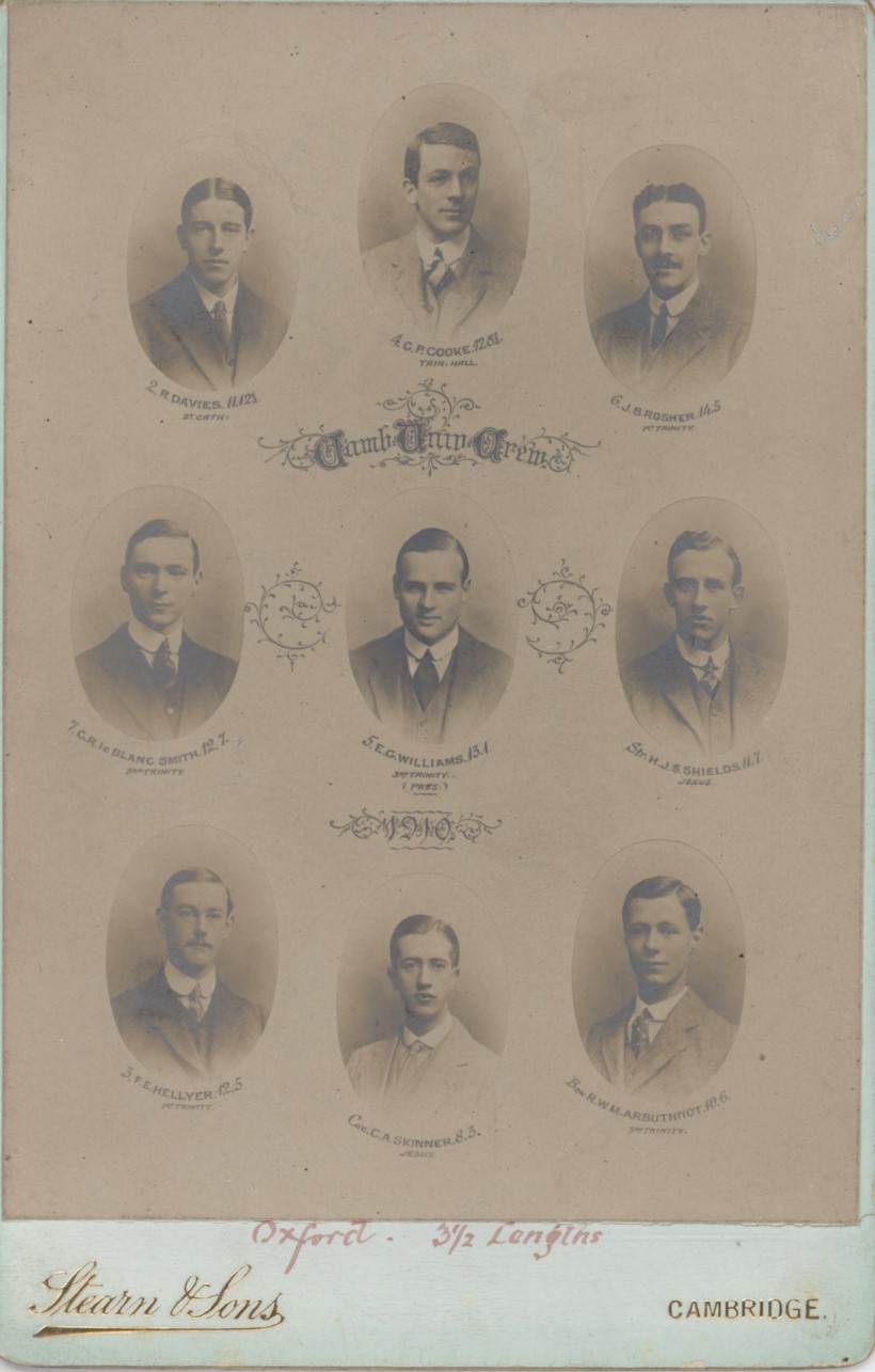 Cabinet card with photographic portraits of the Boat Race crew, including the cox. Margin of victory (Oxford - 3.5 lengths) written in red ink to lower border. Stearn & Sons, Cambridge.
