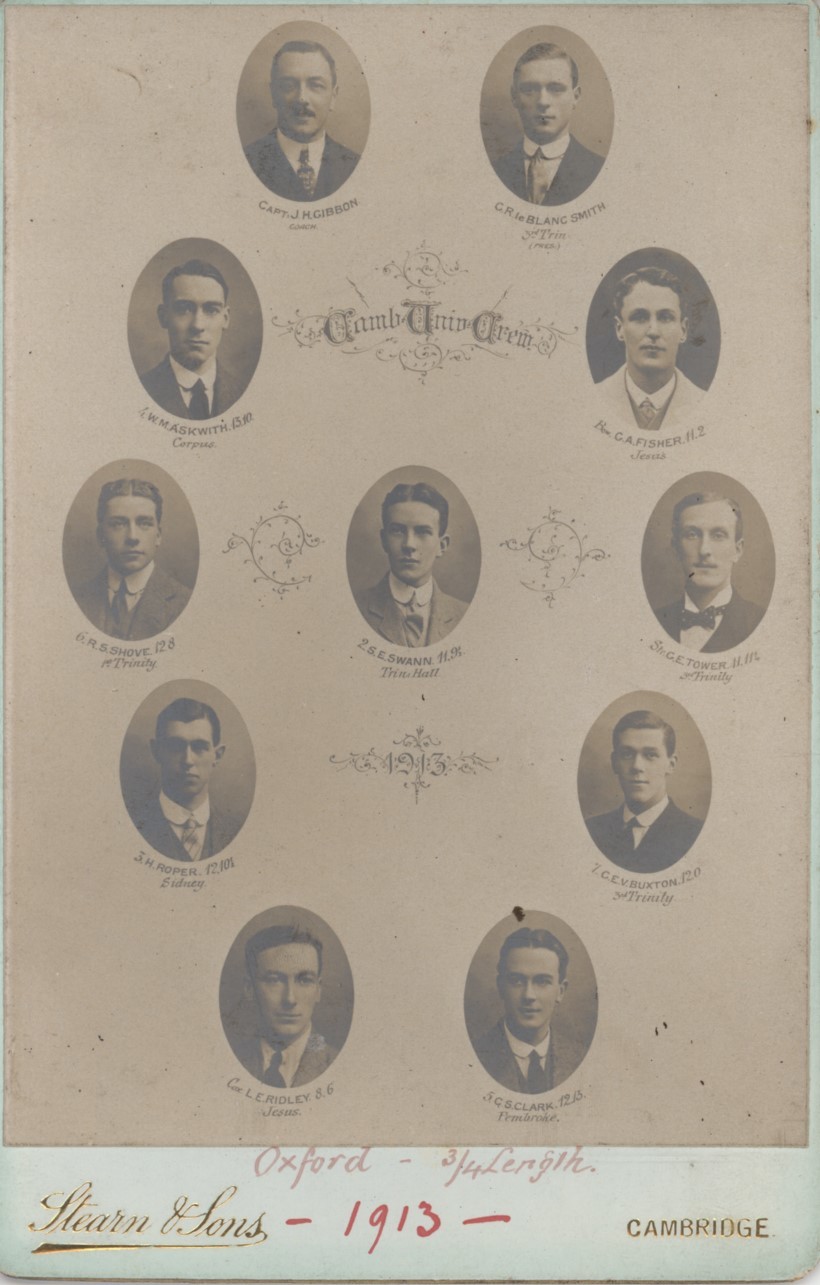 Cabinet card with photographic portraits of the Boat Race crew, including the cox. Margin of victory (Oxford - 0.75 lengths) written in red ink to lower border. Stearn & Sons, Cambridge. The crew included Sidney Swann, Ralph Shove and Sir Harold Roper.
