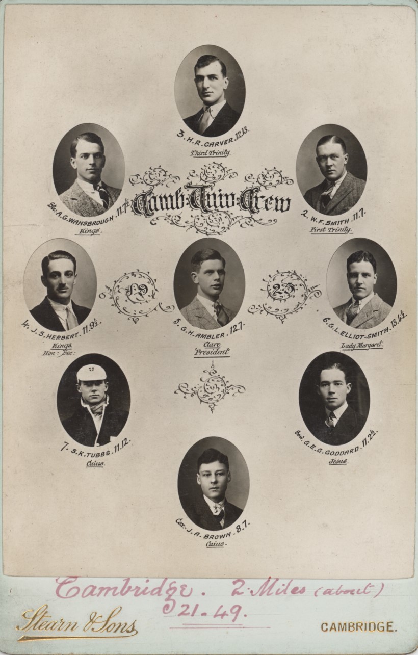 Cabinet card with photographic portraits of the Boat Race crew, including the cox. Margin of victory (Cambridge - 2 miles) written in red ink to lower border. Stearn & Sons, Cambridge.