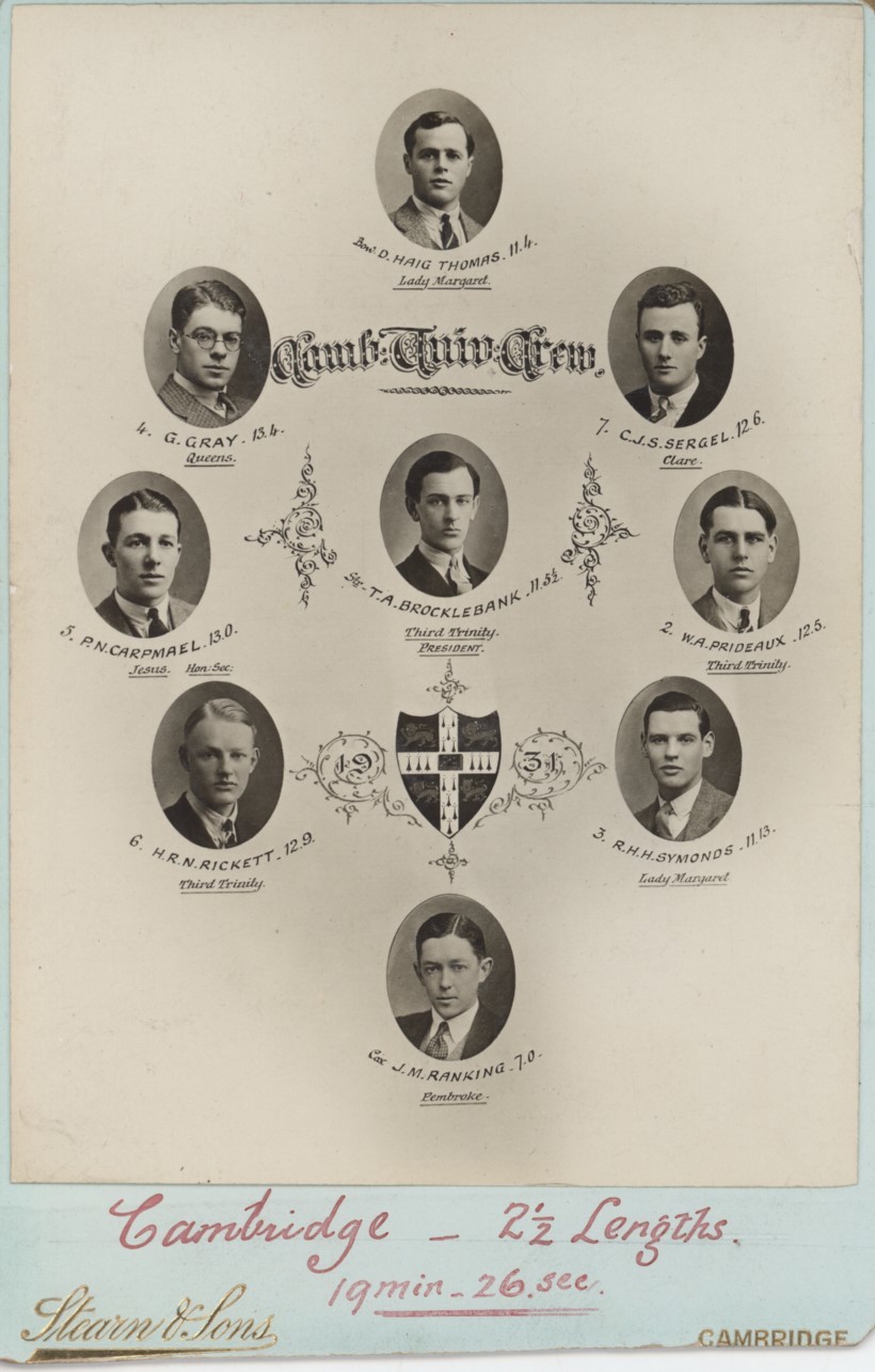 Cabinet card with photographic portraits of the Boat Race crew, including the cox. Margin of victory (Cambridge - 2.5 lengths) written in red ink to lower border. Stearn & Sons, Cambridge. The crew included David Haig-Thomas.
