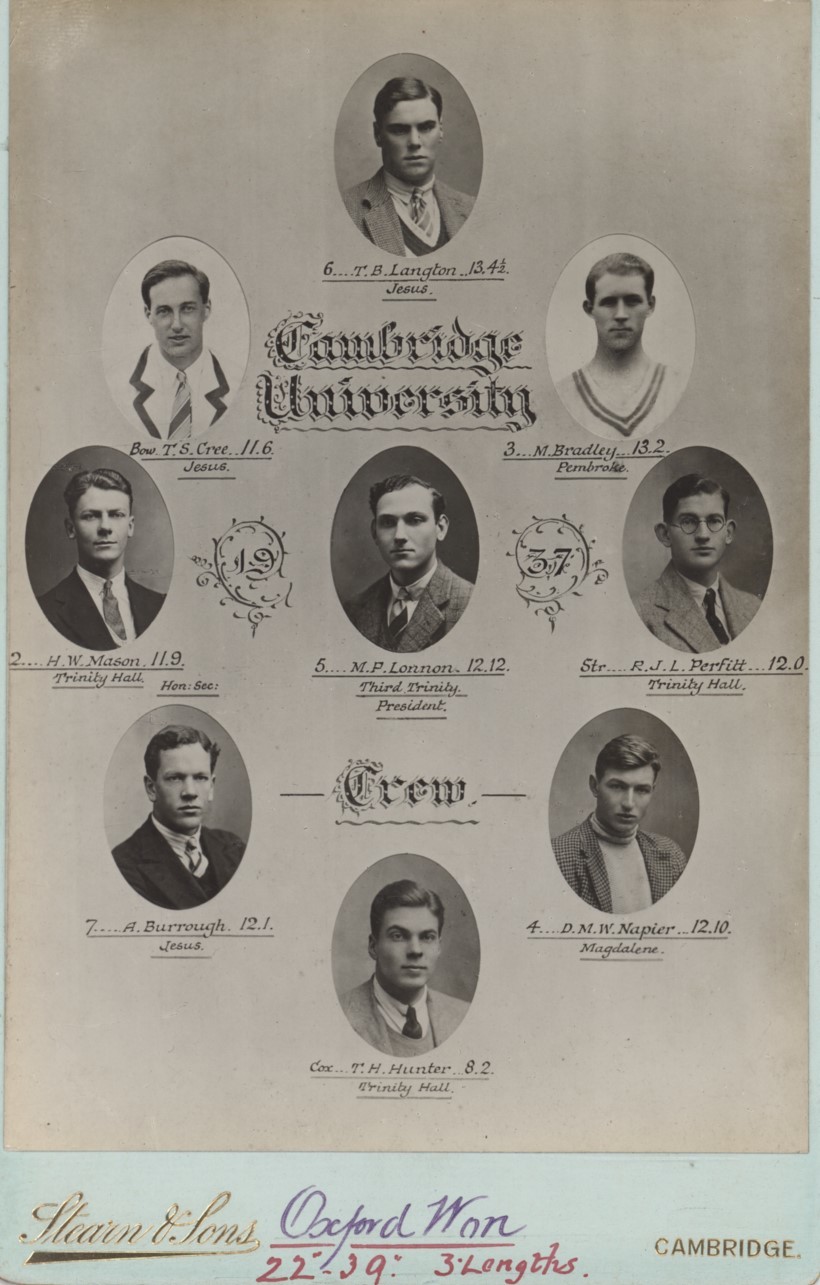 Cabinet card with photographic portraits of the Boat Race crew, including the cox. Margin of victory (Oxford - 3 lengths) written in red ink to lower border. Stearn & Sons, Cambridge. The crew included Alan Burrough.