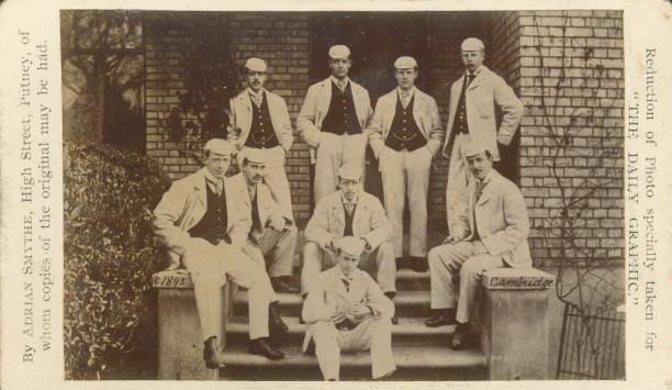 Small cabinet card showing the Cambridge Boat Race crew of 1893 - including Branson, Bayford, Fogg-Elliott, Waller, Ollivant, Kerr, Kerrison, Lewis and Agar. Oxford won the race.