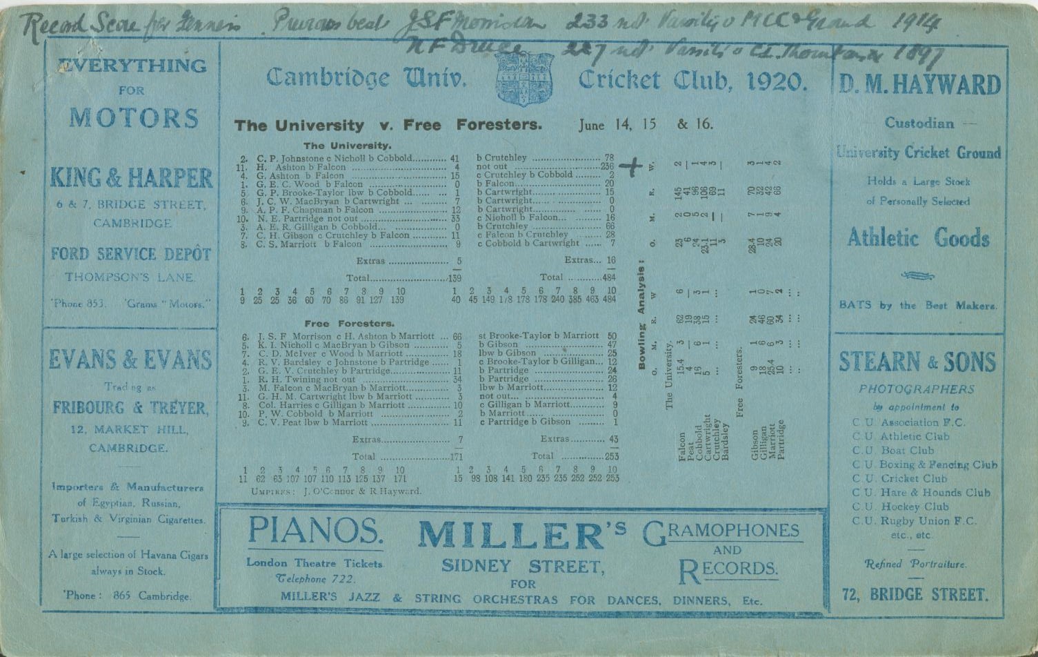 Cricket » Cricket Scorecards » Schools/Universities » CAMBRIDGE UNIVERSITY V FREE FORESTERS 1920 CRICKET SCORECARD - HUBERT ASHTON 236