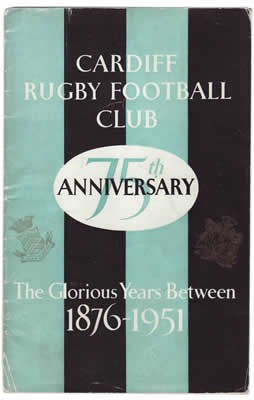 Official rugby programme for the match between Cardiff and the British Lions at Cardiff Arms Park to celebrate the 75th anniversary of Cardiff Rugby Club. The Lions won the match 14-12. The programme is also the official anniversary booklet and contains much of interest on the history of Cardiff RFC.