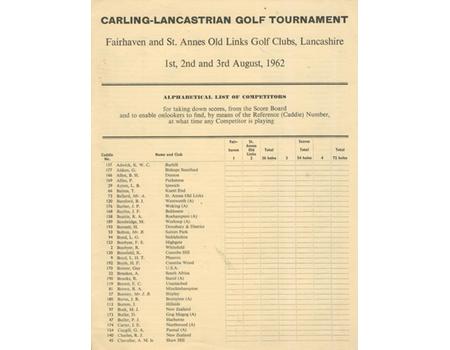 List of competitors for the Carling-Lancastrian tournament, played at Fairhaven and St. Annes Old Links Golf Clubs on August 1-3, 1962.