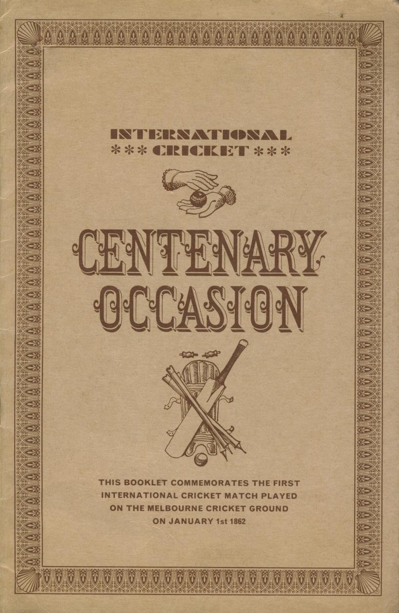 Booklet produced to commemorate the centenary of the first international match played at the MCG on January 1st 1862 between HH Stephenson's England Xl and Melbourne & Districts XVlll. Published to coincide with the arrival of Ted Dexter's England team for the 1962-63 Ashes series.