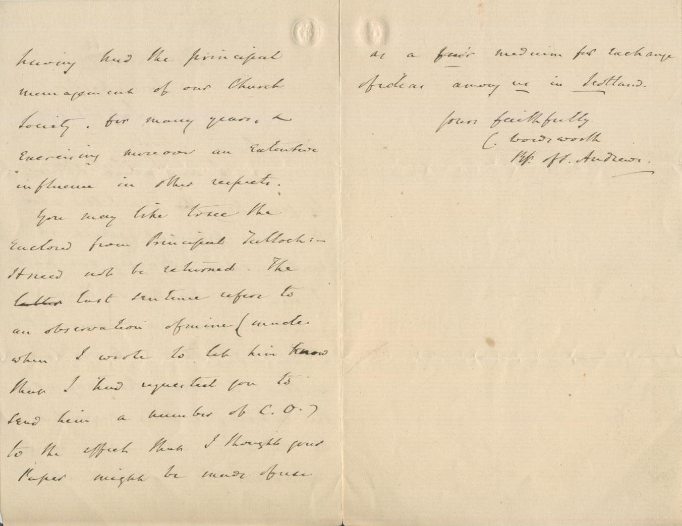 Original handwritten letter from Charles Wordsworth, the Bishop of St. Andrews, to an unknown recipient, dated 1871 and sent from Winchester College. The contents seem to relate to matters of the church. Wordsworth was the nephew of the poet William Wordsworth and was a noted rower and cricketer at Harrow and Oxford. He is widely credited with instigating the very first Varsity cricket match in 1827, in which he played and captained Oxford, and also the very first Boat Race in 1829, in which he also participated. A true giant in the history of sport.