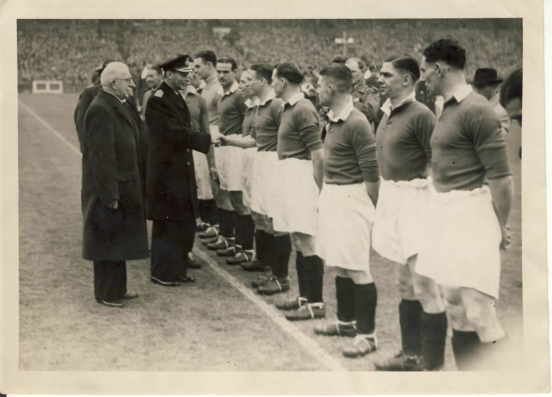 Original black and white football photograph showing Chelsea players being presented to King George VI before the Football League South Cup Final at Wembley on 7 April 1945. Chelsea defeated Millwall 2-0. Wembley Stadium Photographic Department.