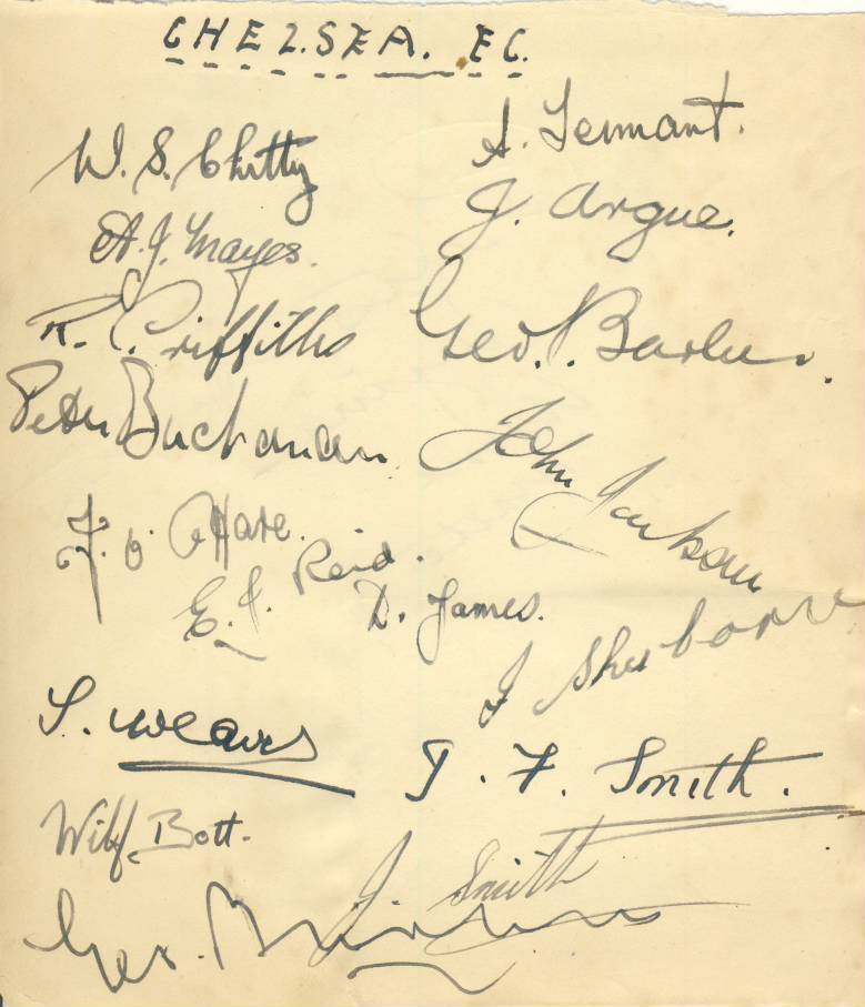 Album page. Signed in ink by 18 players from the late 1930s, including Chitty, Mayes, Griffiths, Buchanan, O'Hare. Reid, James, Weaver, Smith, Sherborne, Barber, Argue, Jackson and Bott (who seemed to play for QPR?).