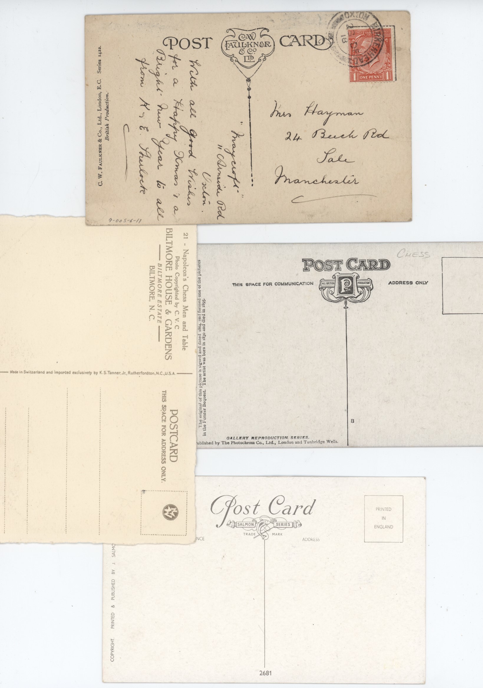 A small collection of 8 postcards featuring chess. Four early twentieth century cards including one of Napoleon's set at Biltmore House and one postally used and dated 1918. Also includes four cards published in Montreal in 1974.