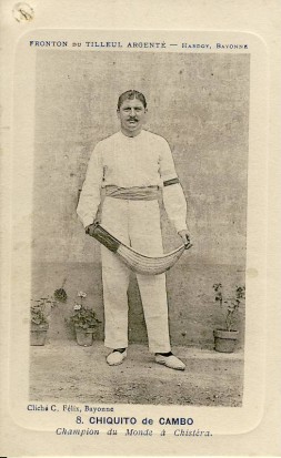 Postcard. Published by Cliché C., Bayonne. Chiquito De Cambo (real name Joseph Apesteguy) was the World Pelota Champion using a Chistera. Postally unused. Small hole to top left corner. Otherwise very good.