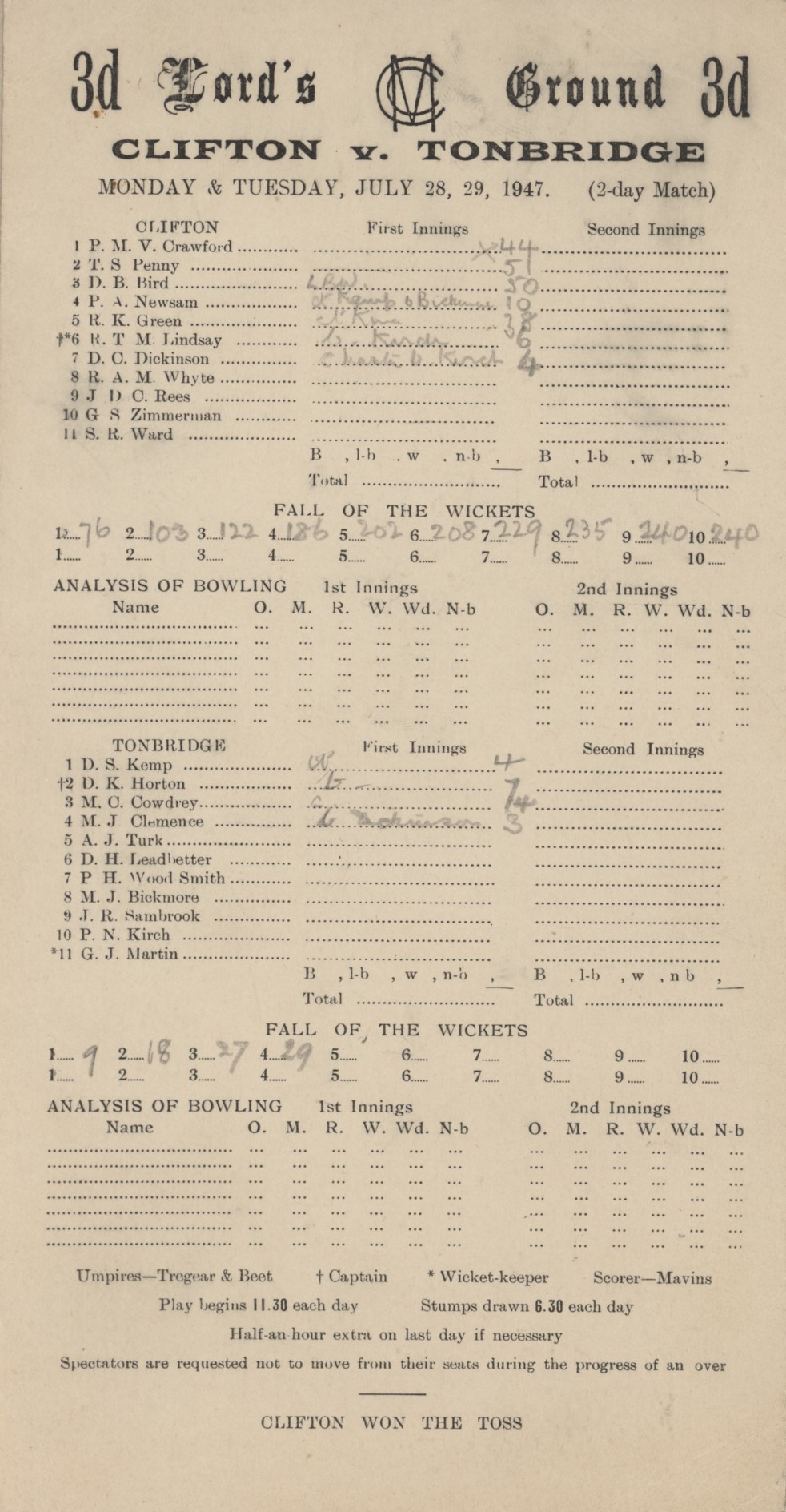 Cricket » Cricket Scorecards » Schools/Universities » CLIFTON V TONBRIDGE 1947 CRICKET SCORECARD