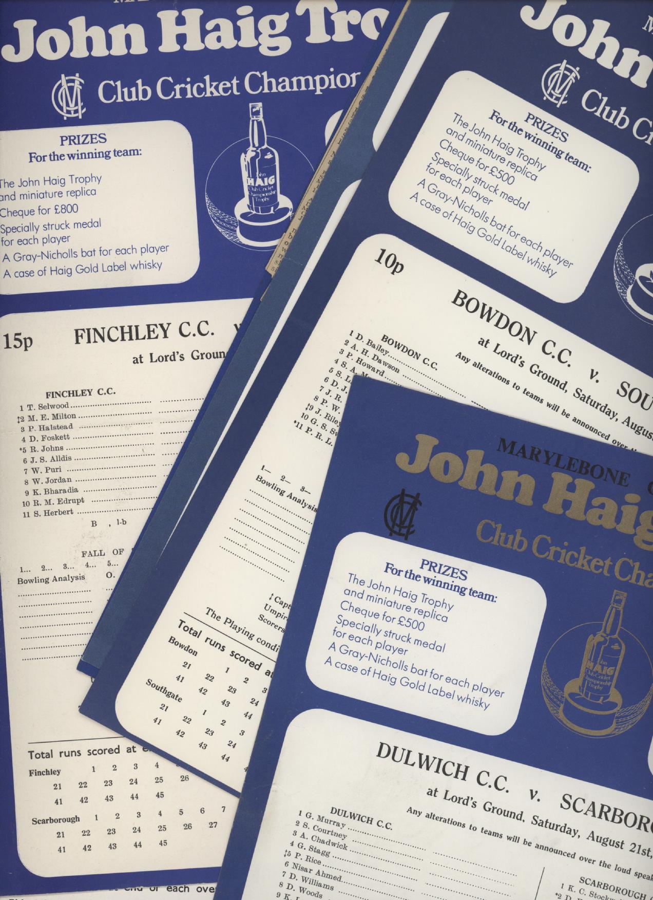 Eleven scorecards for the Club Cricket Championship final matches for 1976-78, 1981-85, 87, 89-90. All matches played at Lord's and under various sponsorship titles.