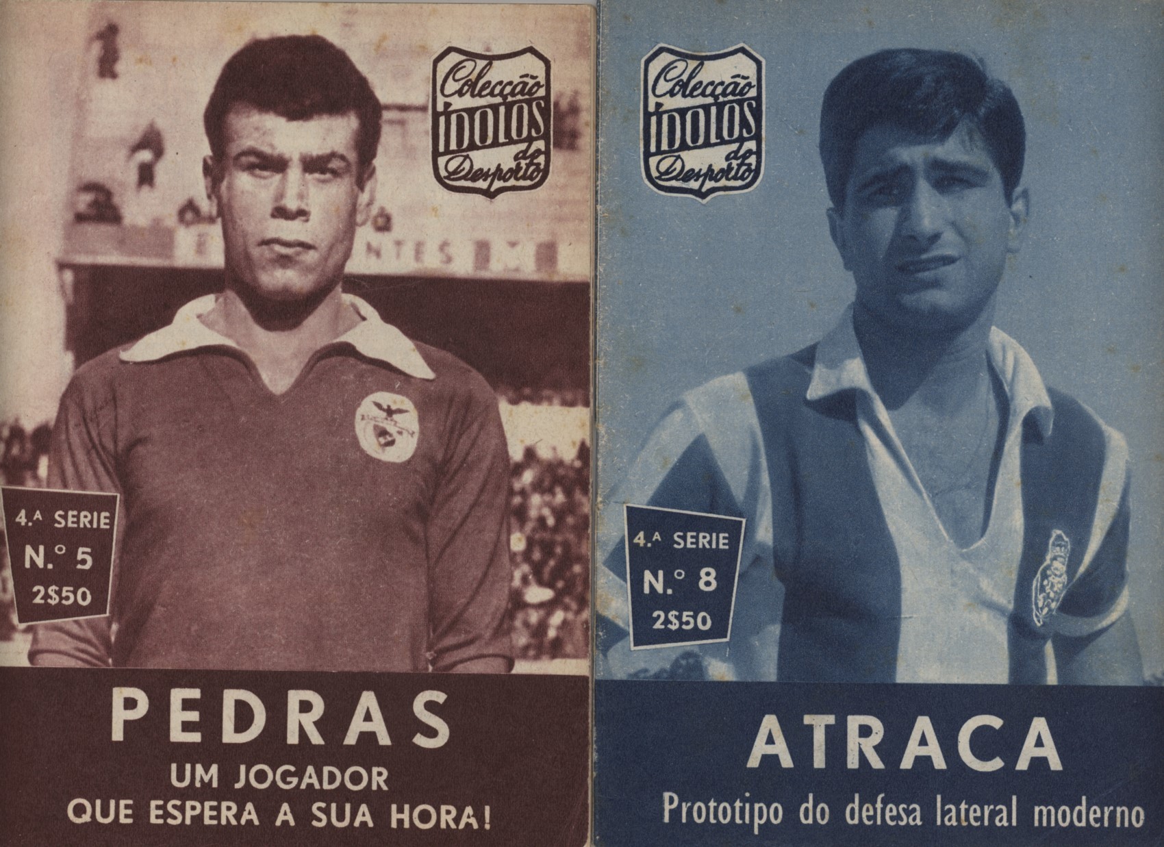 Two examples from the Portugese series of brochures profiling national sporting idols: two leading footballers from the major clubs Porto and Benfica, with photographic illustrations.
