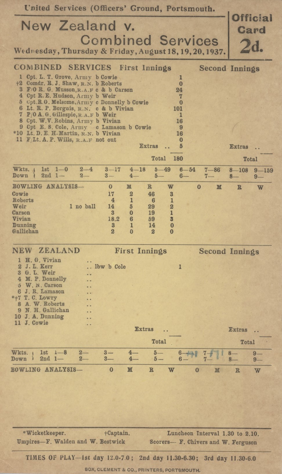 COMBINED SERVICES V NEW ZEALAND 1937 (PORTSMOUTH) CRICKET SCORECARD