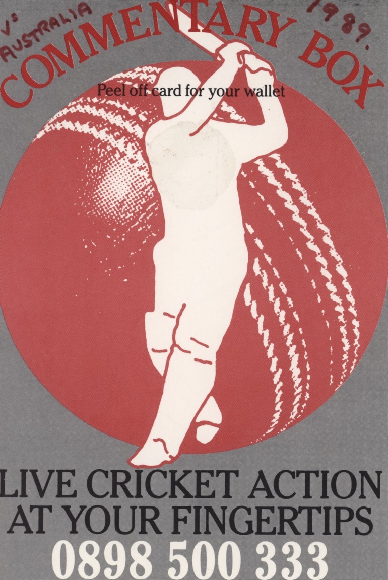 Promotional card signed by five cricketers who were involved in the "Commentary Box", which seems to have been a phone line providing updates on the 1989 Ashes series. The autographs are Mike Smith, Derek Underwood, Farokh Engineer, Alan Knott and Brian Close.