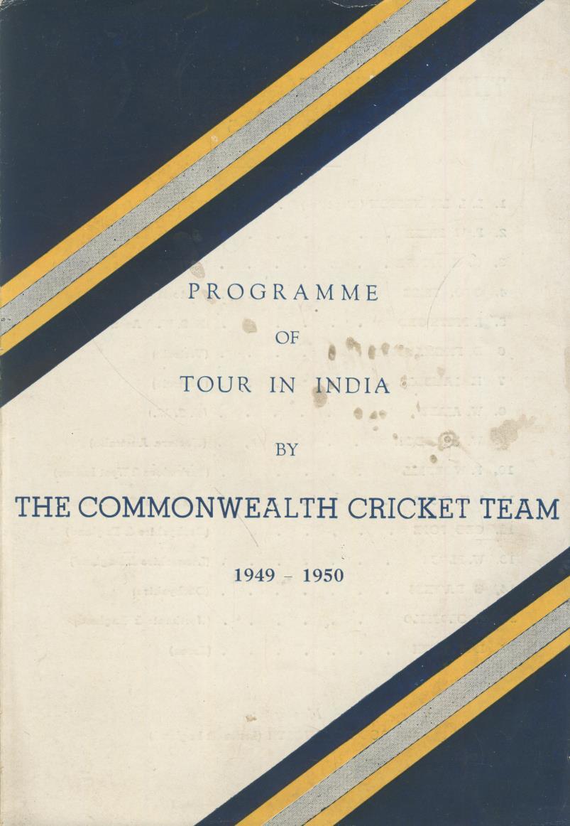 Official cricket tour programme/itinerary for the Commonwealth Cricket Team tour to India in 1949-50. Contains list of players and a full itinerary. The team was made up of Australians, West Indians and English players under the captaincy of L.L. Livingston, including Frank Worrell, Alley, Tribe, Pepper, Place etc.