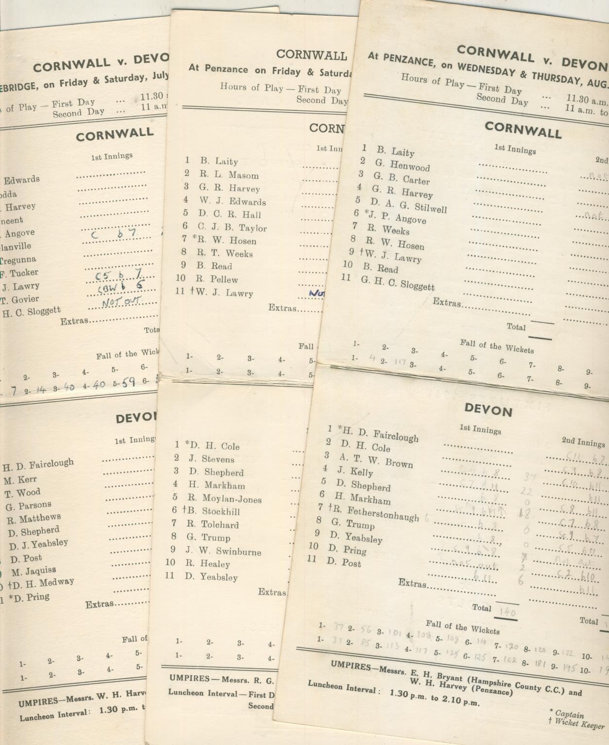 Three cricket scorecards for matches between Cornwall and Devon - August 30-31, 1961 at Penzance; July 27-28, 1962 at Wadebridge; July 31- August 1, 1964 at Penzance.
