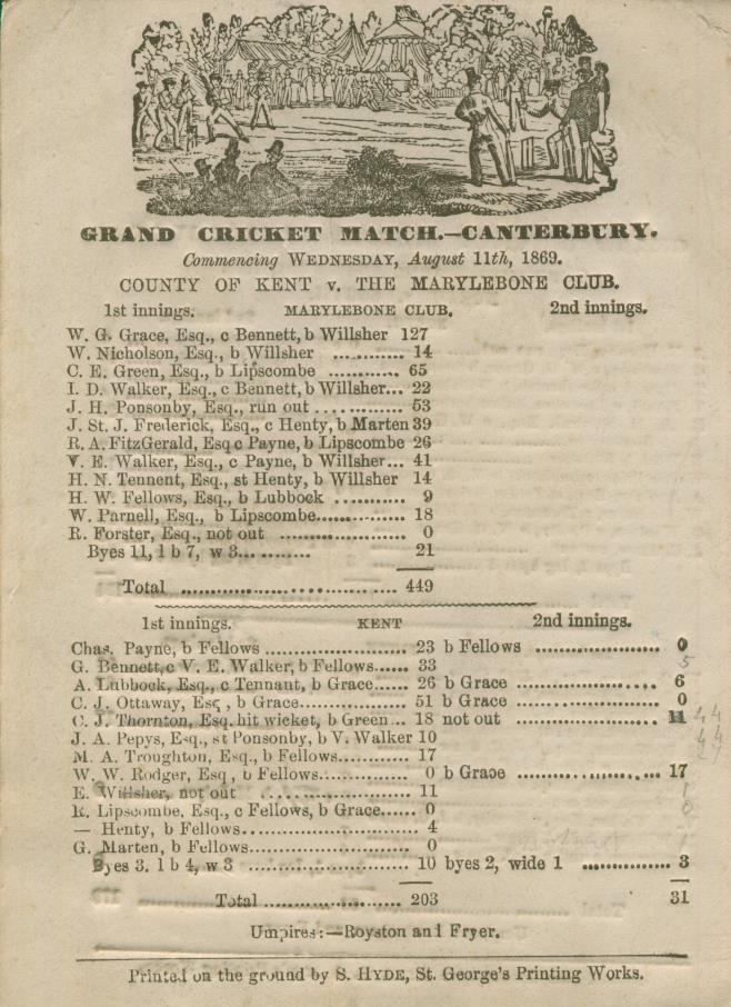 Cricket » Cricket Scorecards » Kent » COUNTY OF KENT V THE MARYLEBONE CLUB 1869 CRICKET SCORECARD - GRACE SCORES CENTURY BEFORE LUNCH ON FIRST DAY