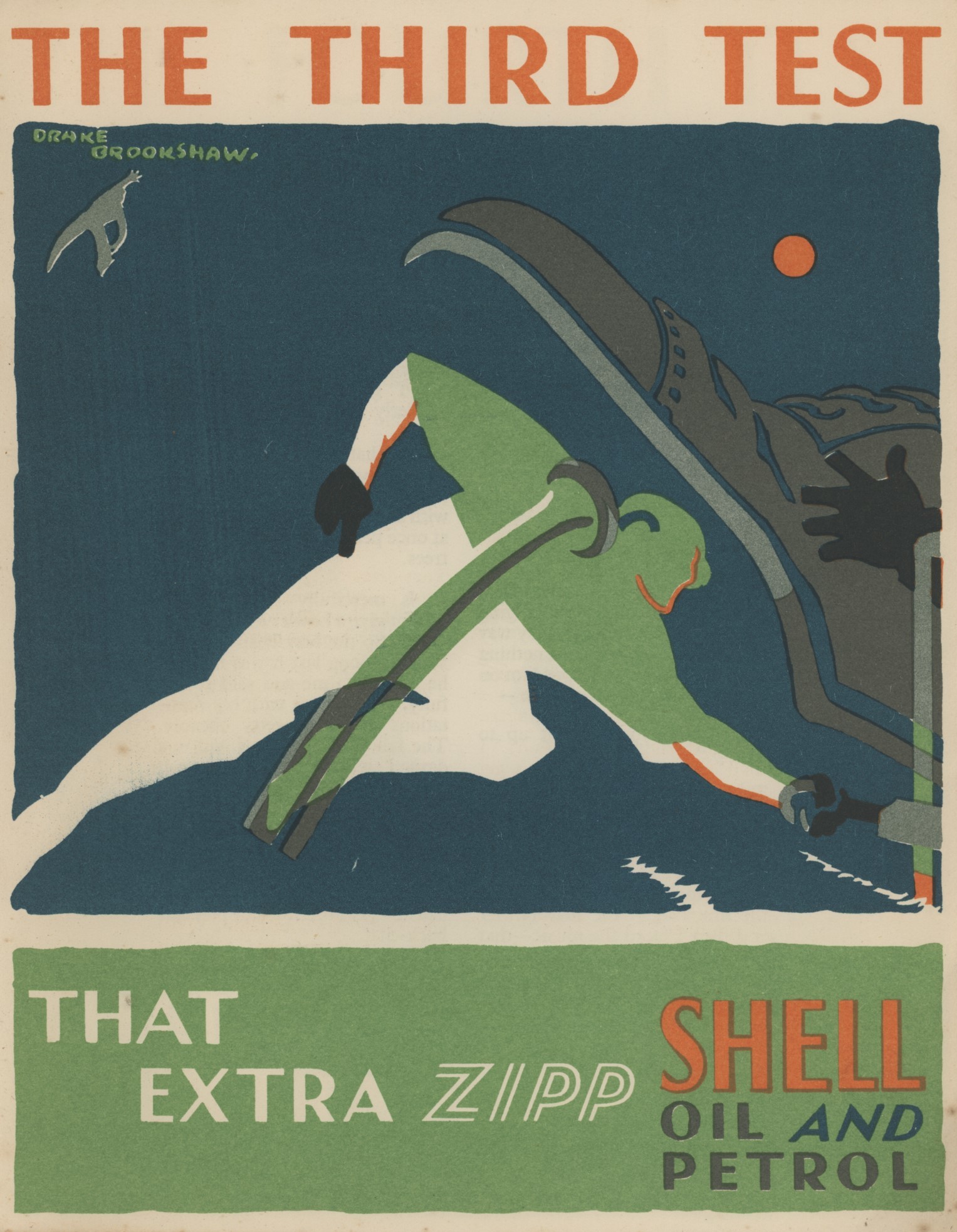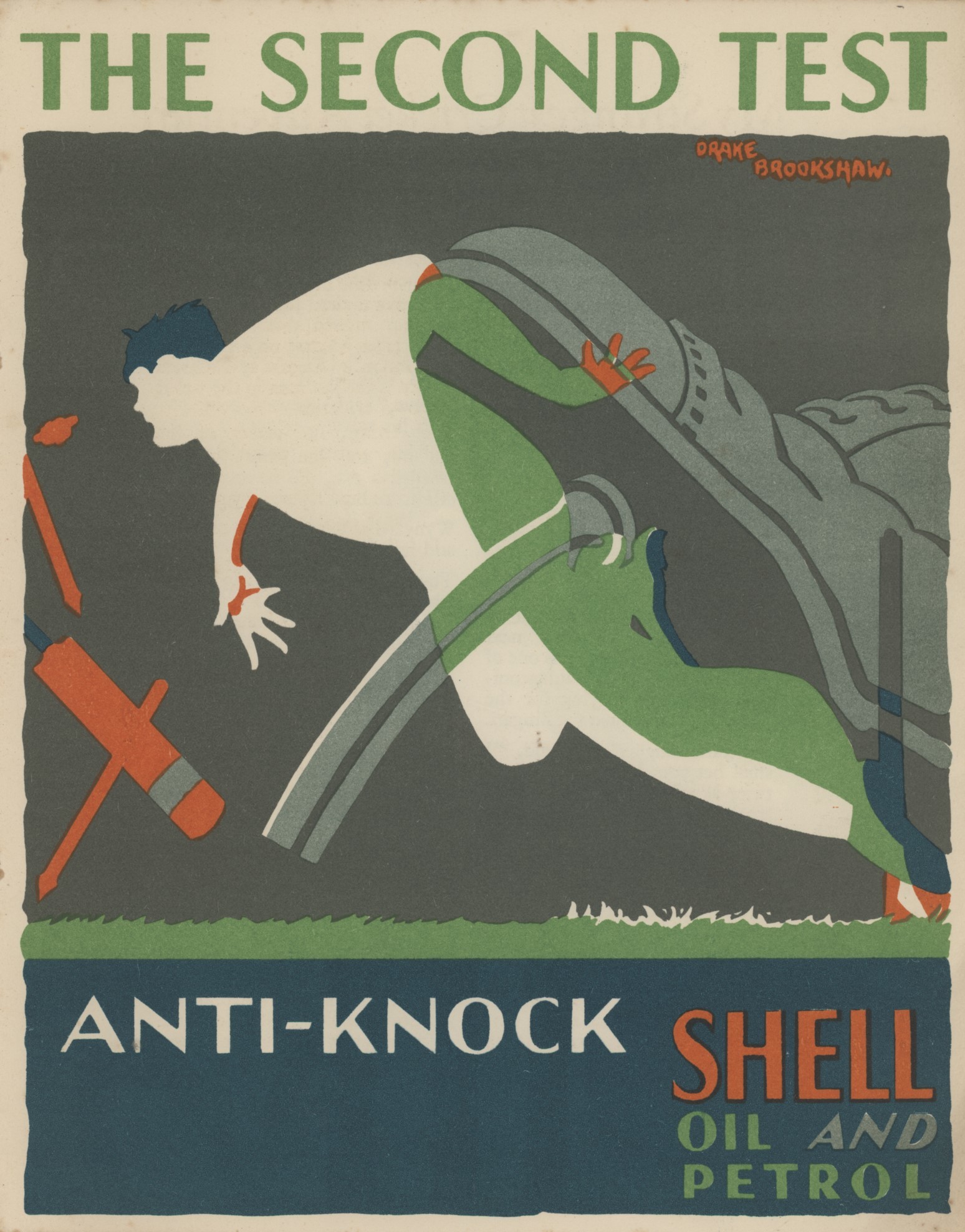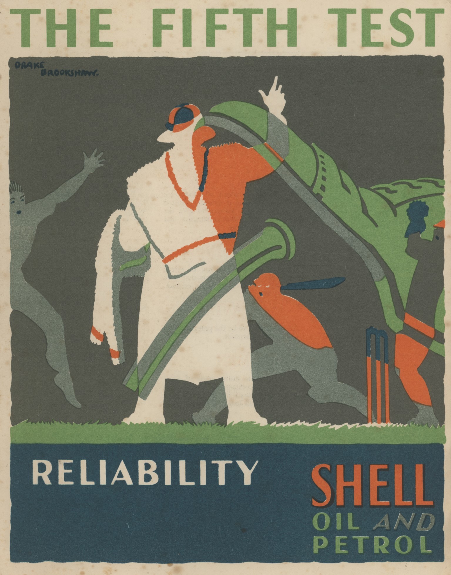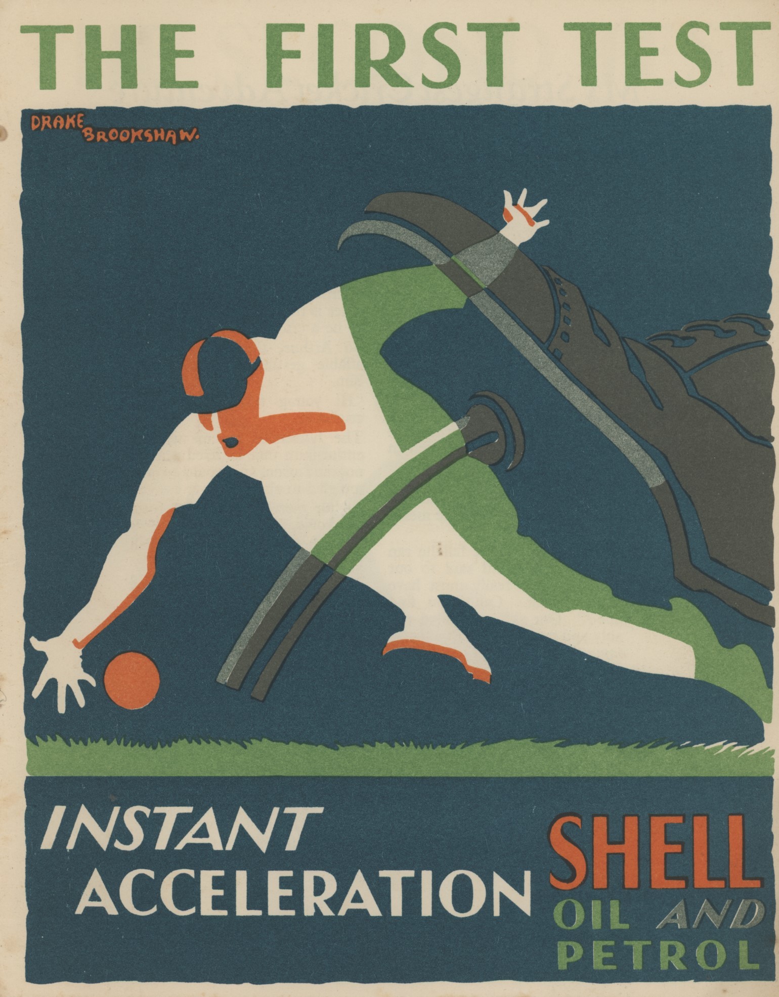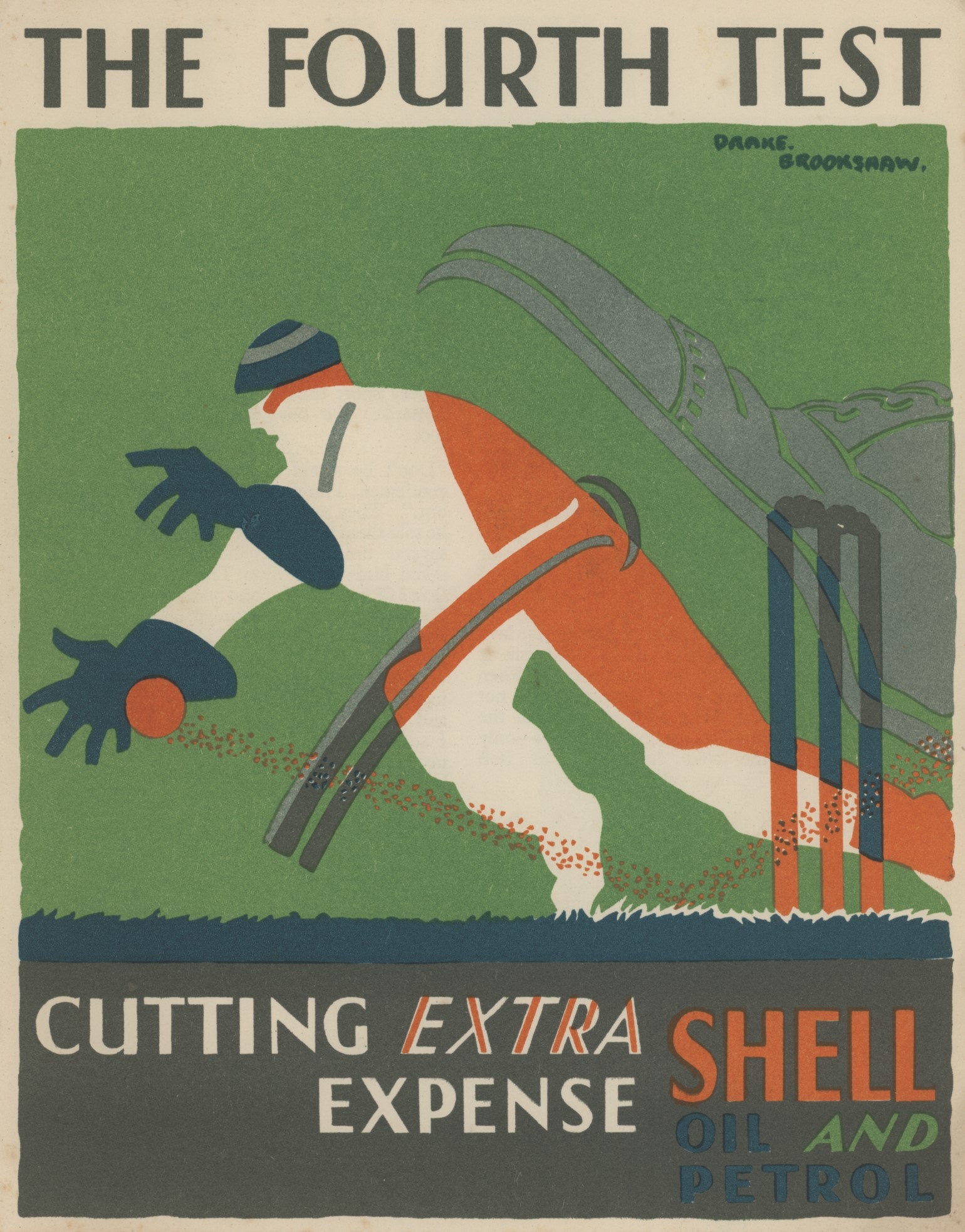 Lovely inter-war promotional brochure issued by Shell featuring 5 chromolithographs by Drake Brookshaw, not including the cover, and corresponding short essays by The Telegraph sportswriter Colonel Philip Trevor. Including memoirs of playing with Gilbert Jessop. Probably published to coincide with the 1930 Ashes series.