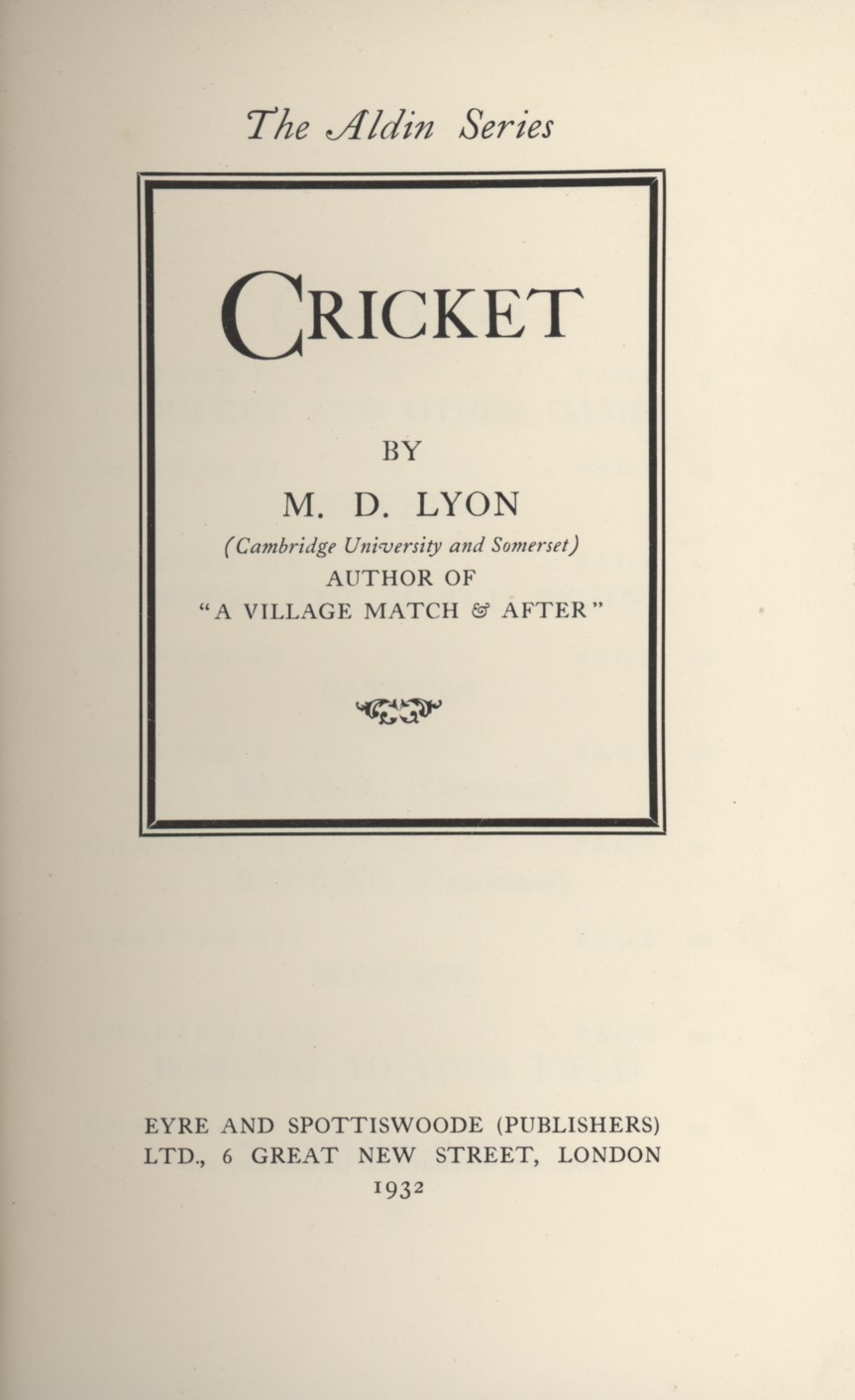 Illustrated cricketing instructional by Somerset player Dar Lyon. Featuring many photographs of the author demonstrating stance and shots etc.