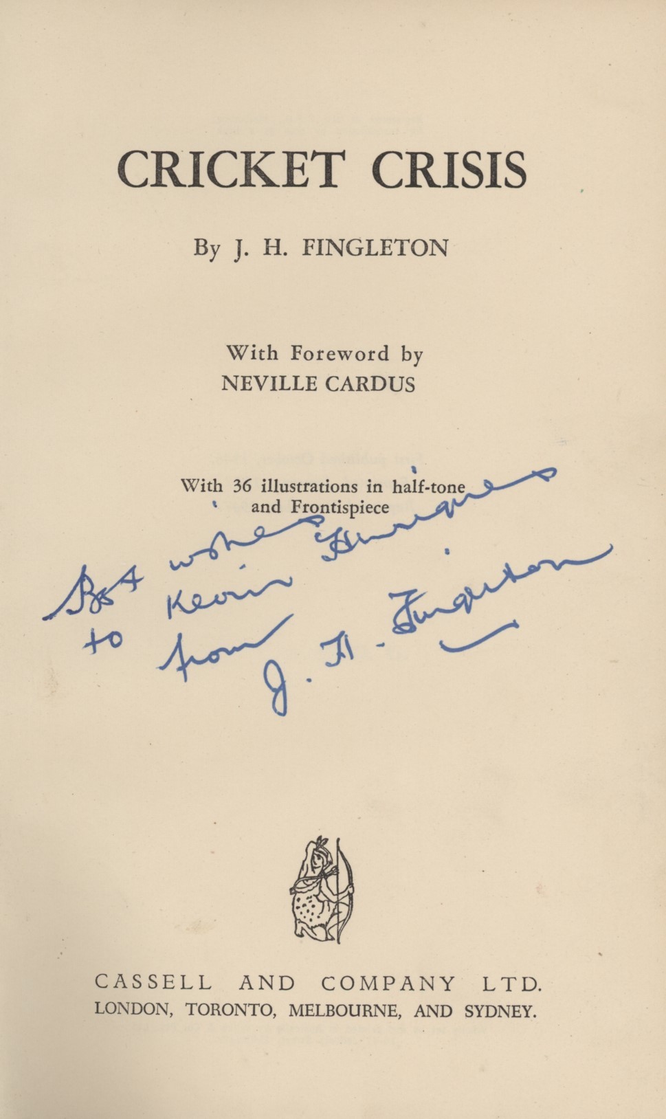 Second, reprinted, edition. 8vo. 295pp. Frontispiece, 36 pages of photographs. Dustwrapper, rubbed with a number of large chips. Bookplate and magazine image of Fingleton laid down to front endpapers. Gift inscription, dated 1948, to fly-leaf. A fair/good copy. With a signed dedication from Jack Fingleton to the Financial Times critic and cricket enthusiast Kevin Henriques on the title-page.