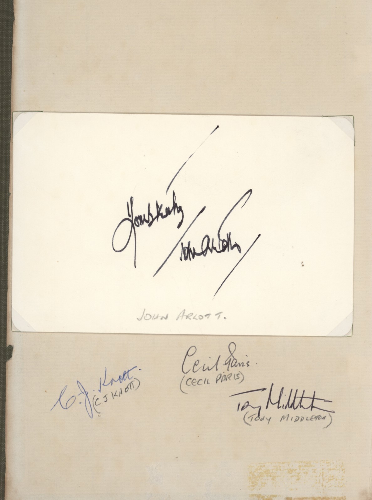 1st edition. large 8vo. 192pp. plus 56 pages of photos and frontispiece. Heavy foxing throughout, particularly to page edges and endpapers. In the quarter buckram, gilt titles and crest to front. Minor bumping to corners. Good condition. Signed to front pastedown by 3 Hampshire cricketers - C.J. Knott, Cecil Paris and Tony Middleton, and by Arthur Holt to half title-page. A large card signed by John Arlott is corner mounted to front pastedown.