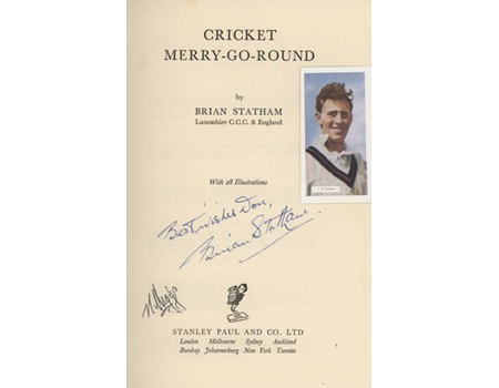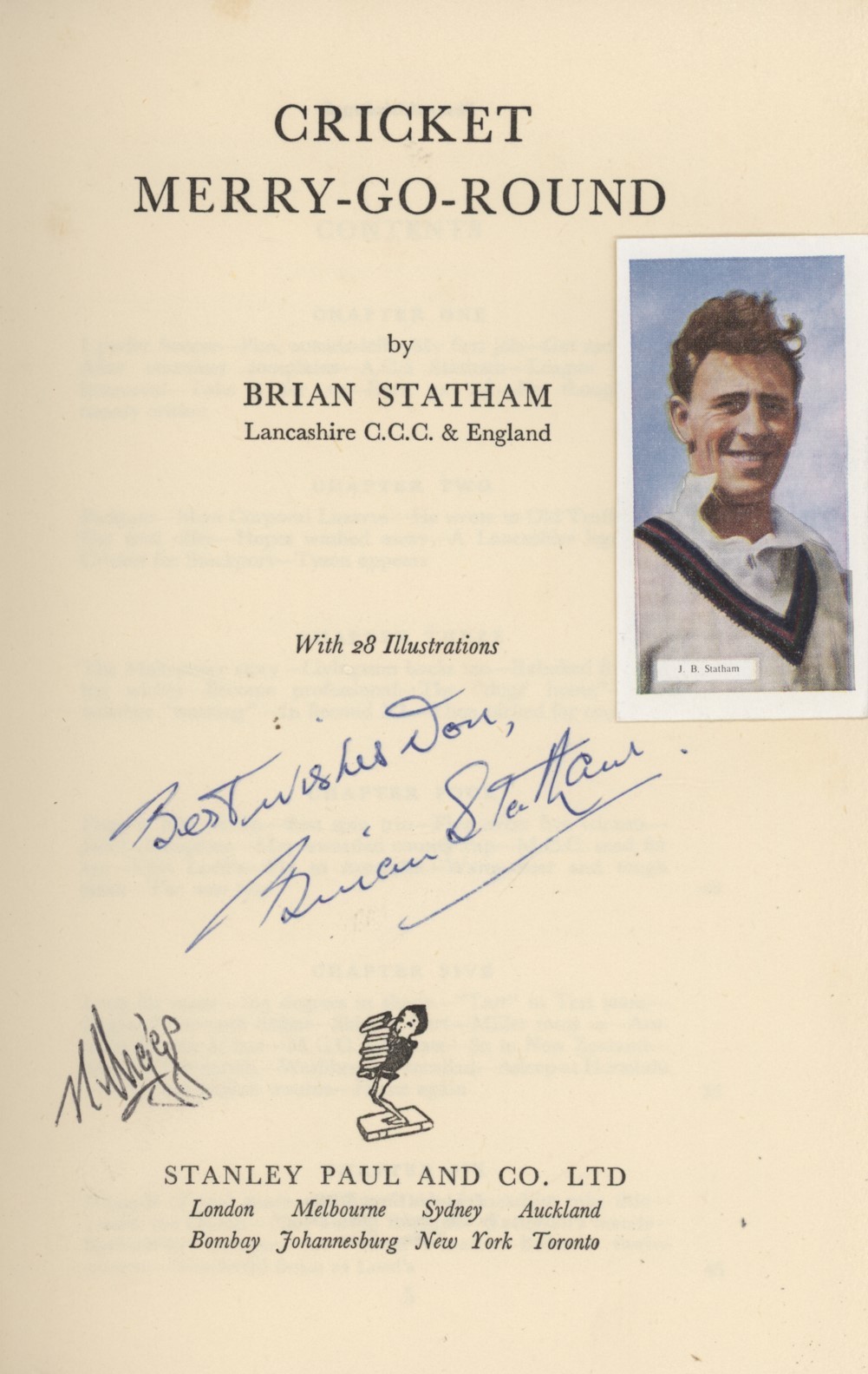 8vo. 192pp. Photographic frontis., 14 pages of photographs. Bookplate to front pastedown. Dust-wrapper, very good. Signed to title-page by Statham and Ken Higgs. Also signed to fly-leaf by more Lancashire cricketers, including Statham (again), Cyril Washbrook, Ken Grieves, Tommy Higson, Jack Bond, Bob Bennett, David Hughes and Neil Fairbrother. A cigarette card of Statham is also laid down to title-page.