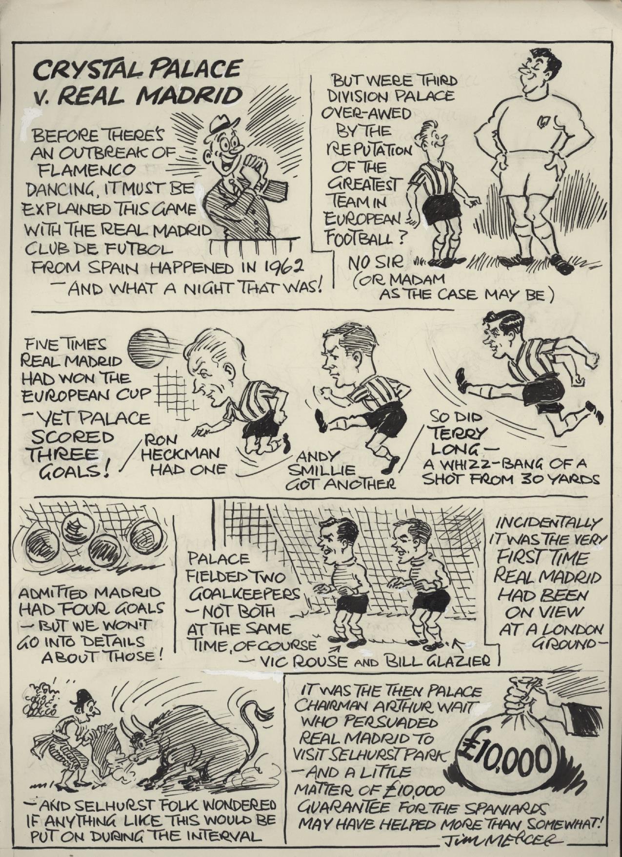 Original humorous artwork by the prolific South London cartoonist Jim Mercer commemorating the visit of Real Madrid to Selhurst Park in 1962, when a celebrated performance by 3rd Division Crystal Palace against the Spanish giants saw the match finish 3-4. Presumably this was original artwork for a local paper or club publication.